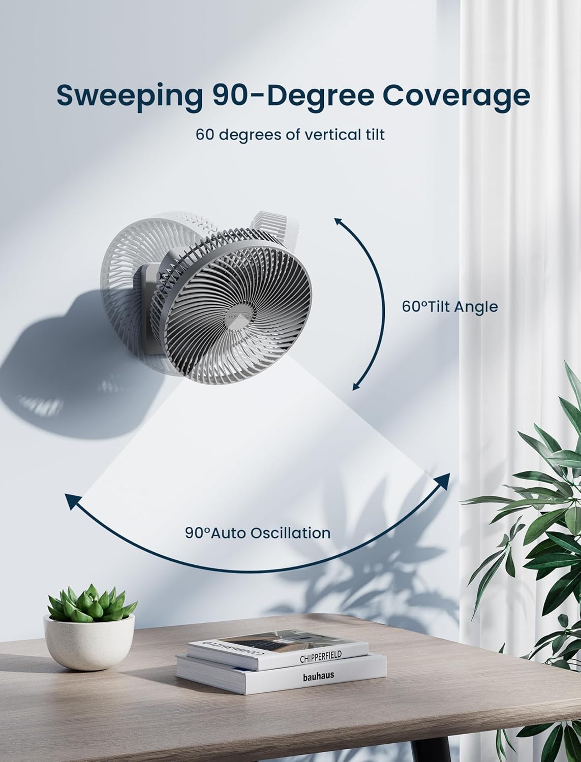 The fan offers 90° oscillation for wide airflow coverage.