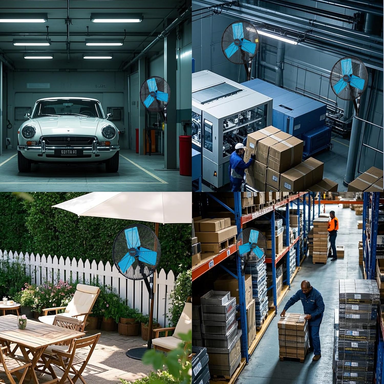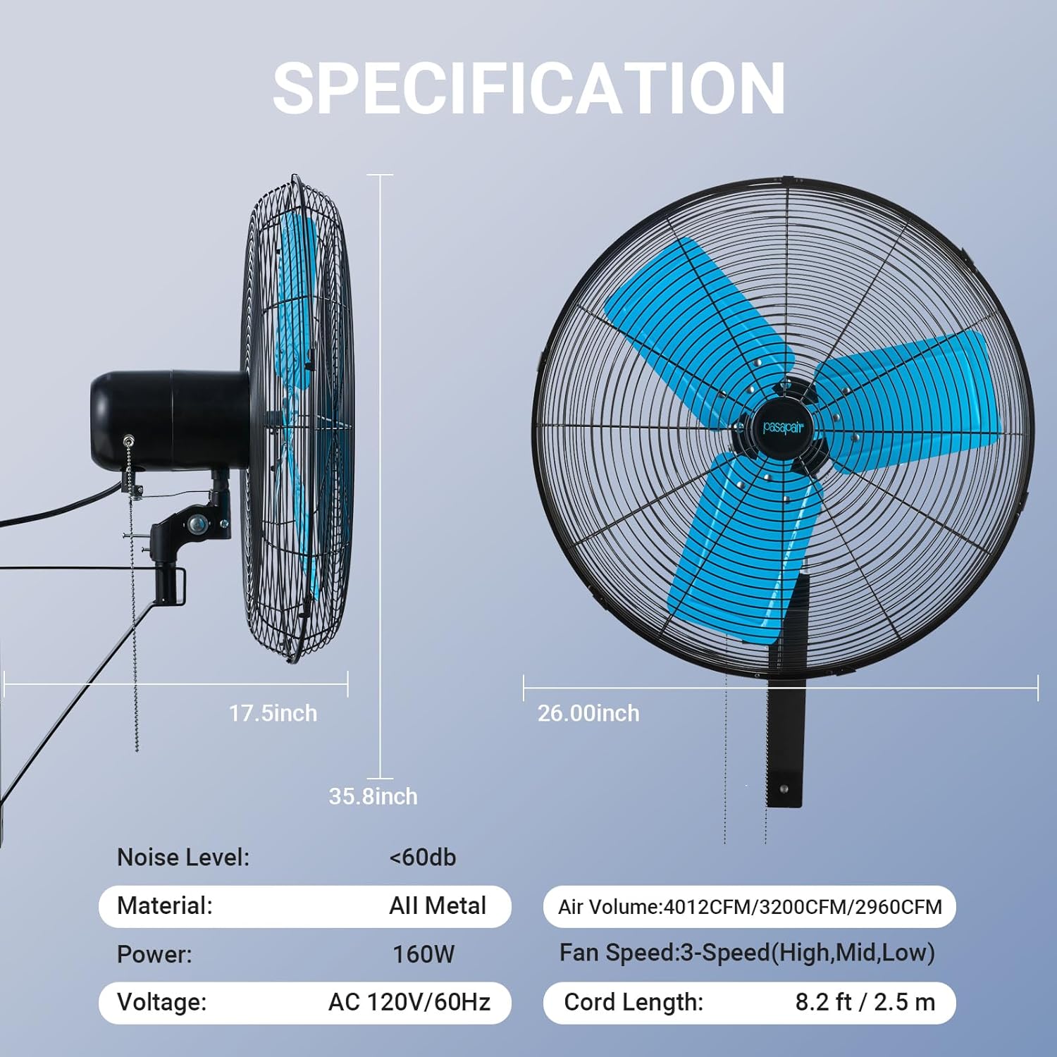 Upgrade your cooling experience with our Heavy-Duty Wall-Mounted Oscillating Fan. This powerful fan is designed for both home and commercial spaces, featuring three high-performance aluminum blades and three adjustable speed settings. With a maximum airflow of 5500 CFM, it is ideal for large areas like warehouses and workshops. The fan offers 90-degree oscillation and 45-degree airflow coverage, ensuring efficient cooling. Operating at just 60 decibels, it is suitable for quiet environments.