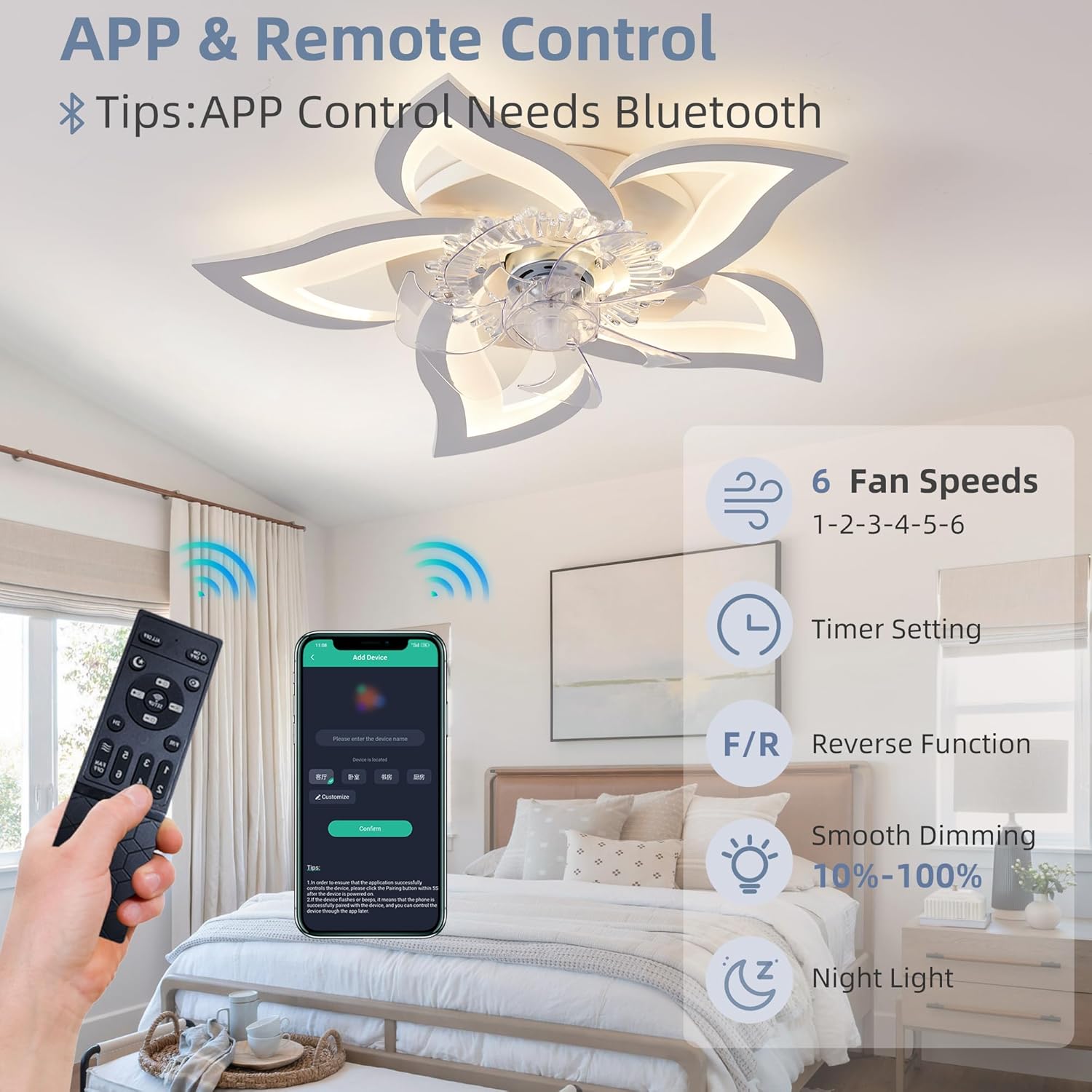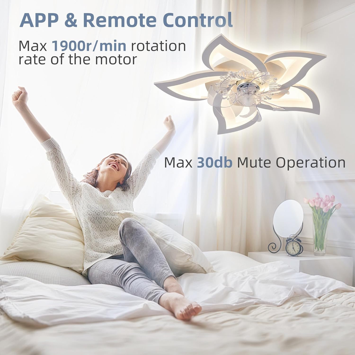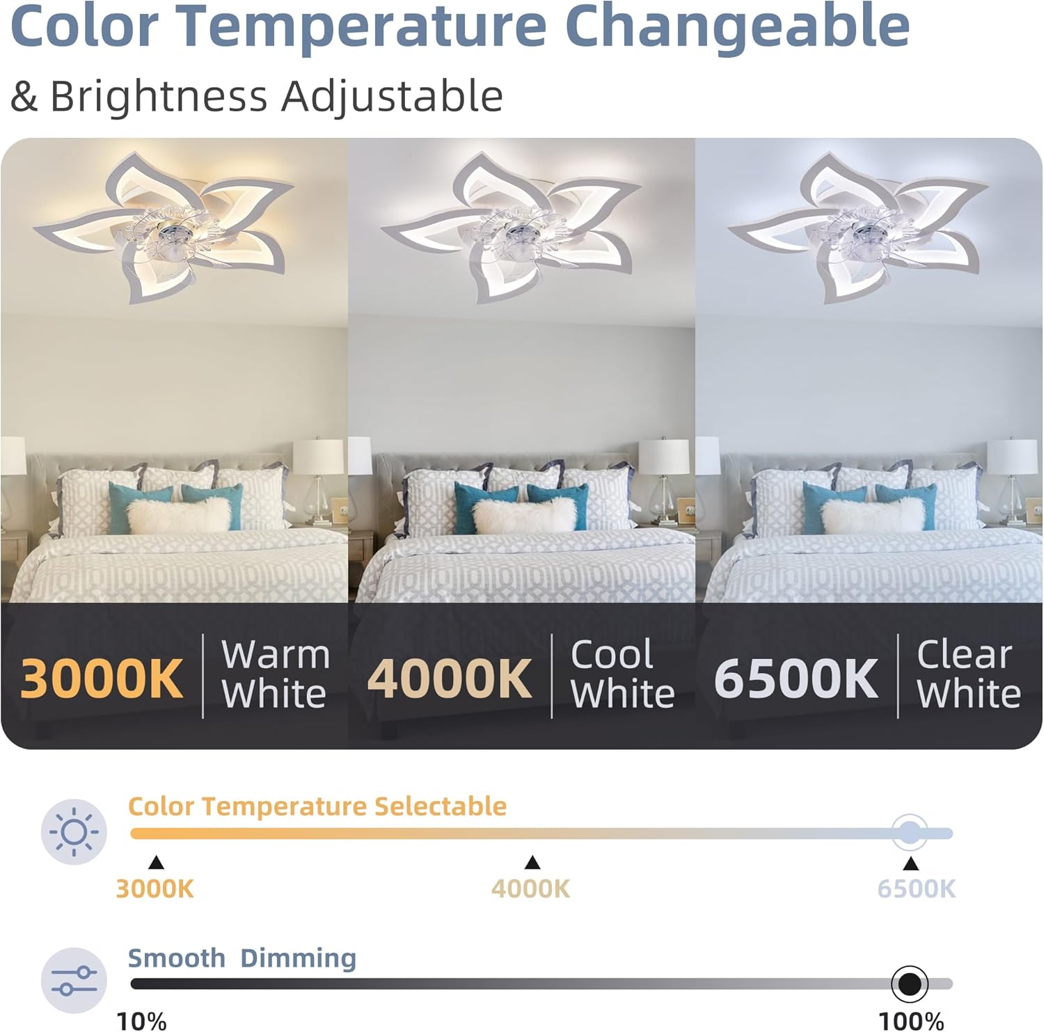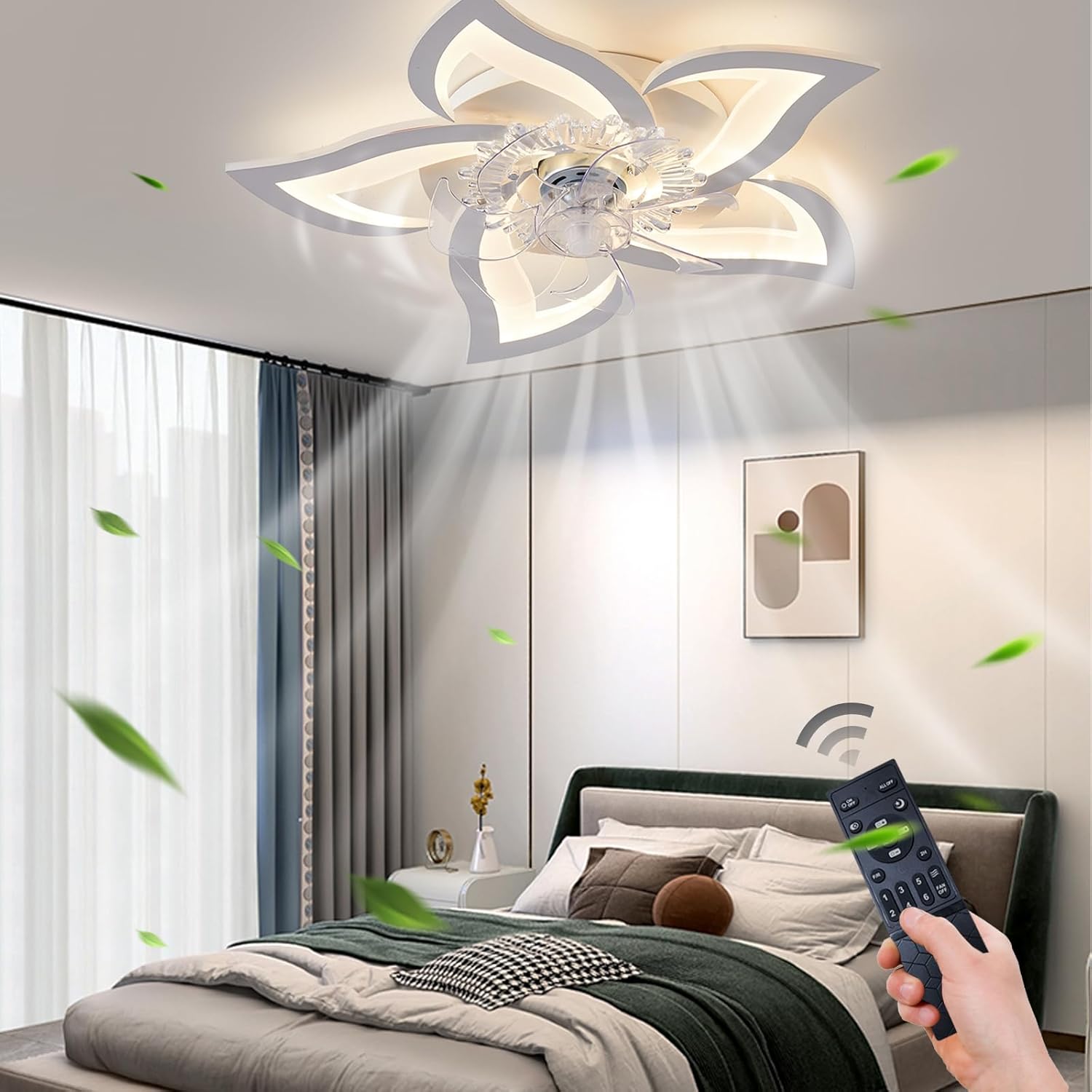 27.2‘’ Ceiling Fan with Lights and Remote Control, 5 Petals Modern Bladeless Flush Mount Fan Light, Low Profile 3 Switchable LED Light and Ultra Quiet 6 Gear Wind Speed, Ceiling Fan with Smart Timer