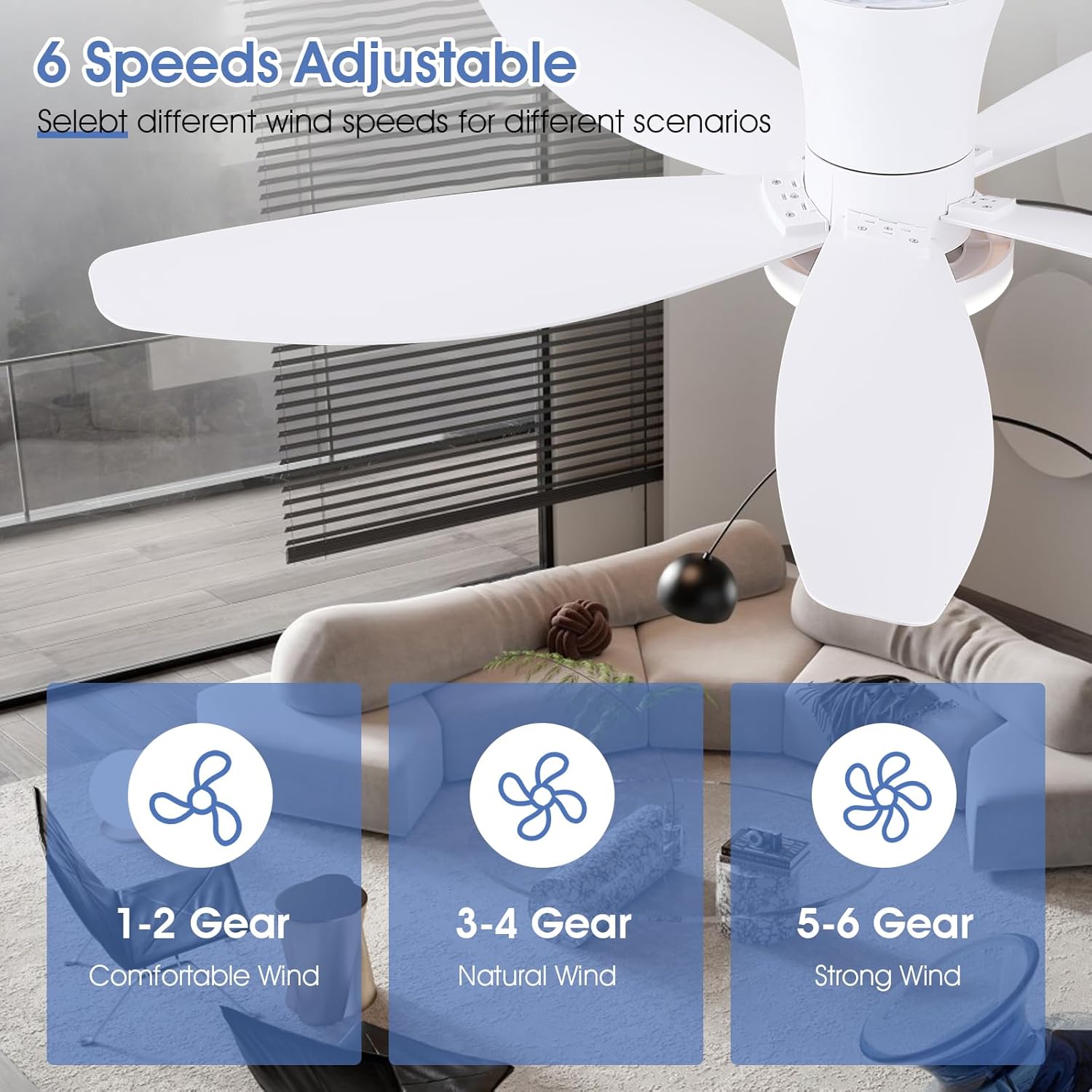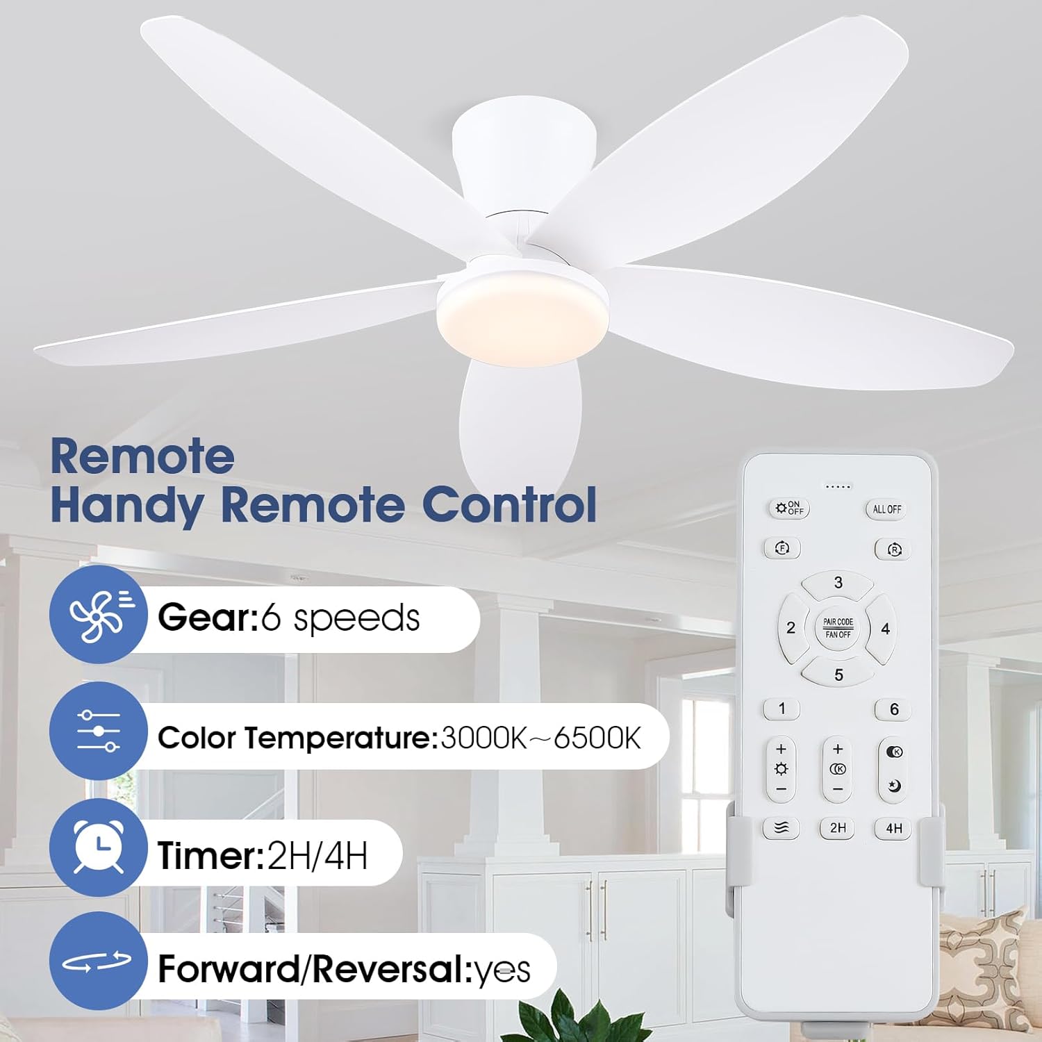 The 42" Ceiling Fan with Lights is designed for versatility and efficiency. It features a low-profile design, making it suitable for various indoor and outdoor spaces, including bedrooms and patios. This fan comes equipped with a remote and app control, allowing for easy adjustments from anywhere in the room. The fan offers reversible rotation, enabling you to switch between cooling and heating modes based on the season. Additionally, it has three color options for dimmable lighting, enhancing the ambiance of your space.