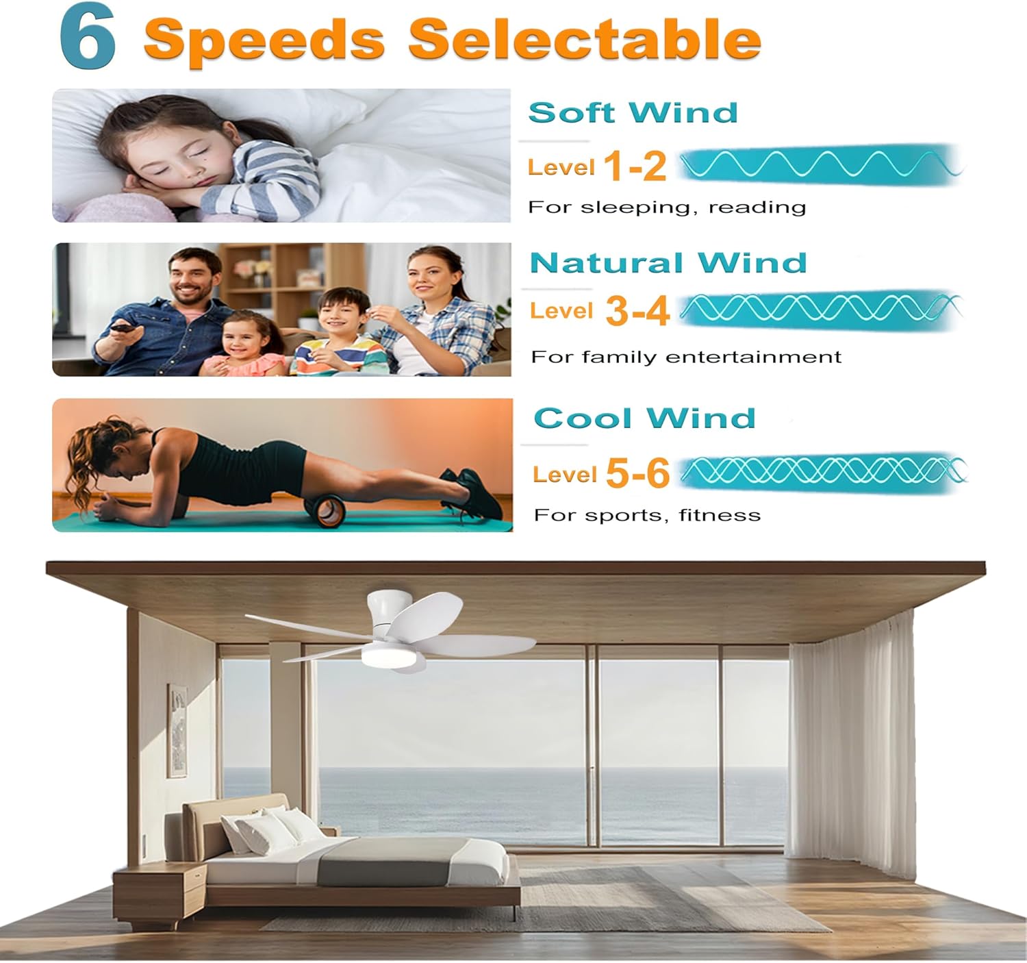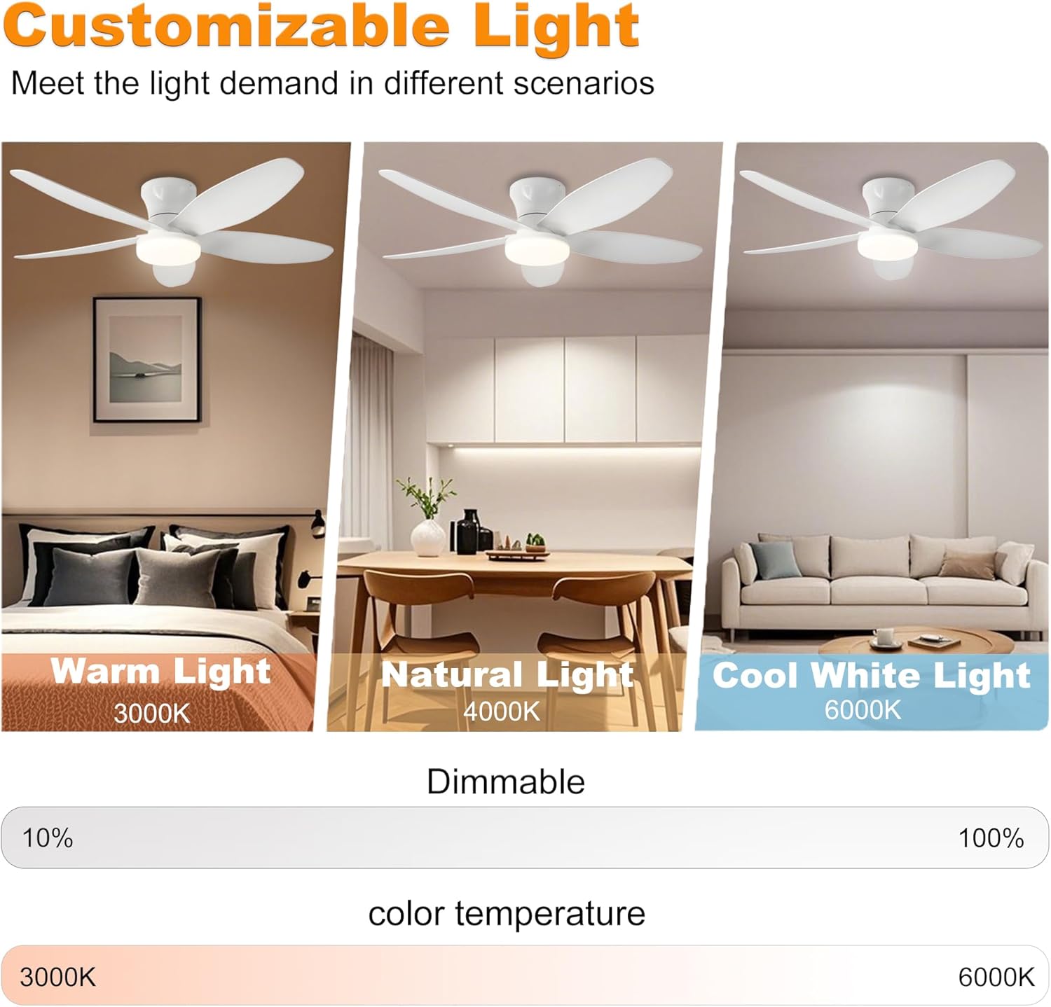 42″ Low Profile Flush Mount Ceiling Fan with Lights & Remote, Dimmable 3-Color LED, 6 Speed Wind, Reversible DC Motor,Timer, Memory Function – Quiet Bedroom & Patio Fan for Indoor/Outdoor Use (White)