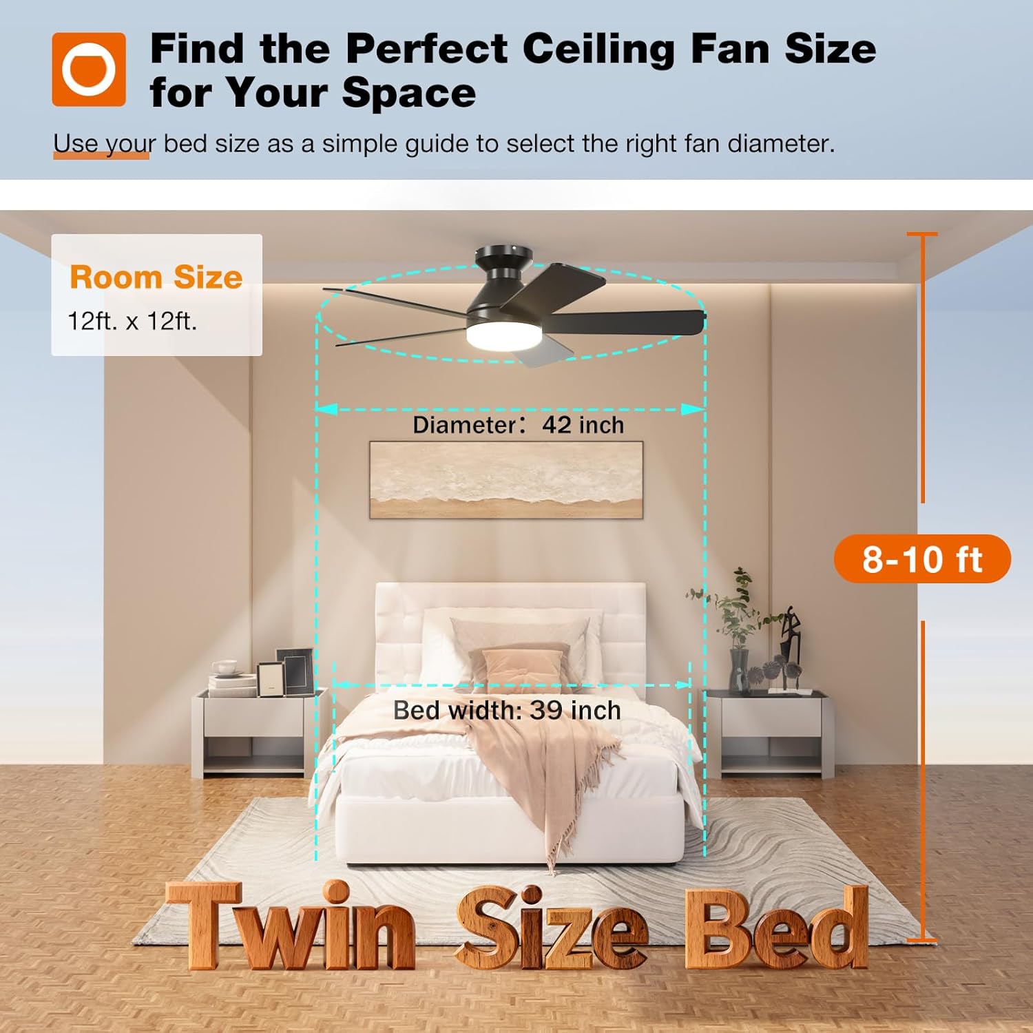 addlon Ceiling Fans with Lights, 42 Inch Low Profile Ceiling Fan with Light and Remote Control, Flush Mount, Reversible, 3CCT, Dimmable, Quiet, Black Small Ceiling Fan for Bedroom Indoor/Outdoor Use