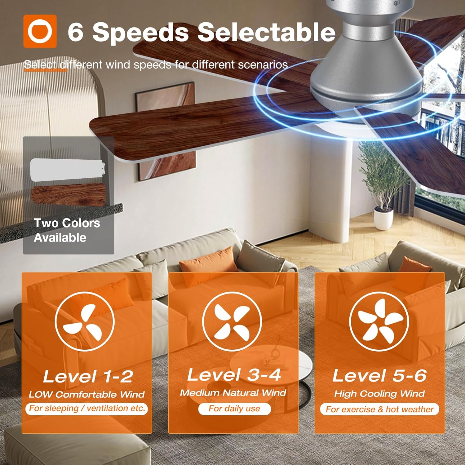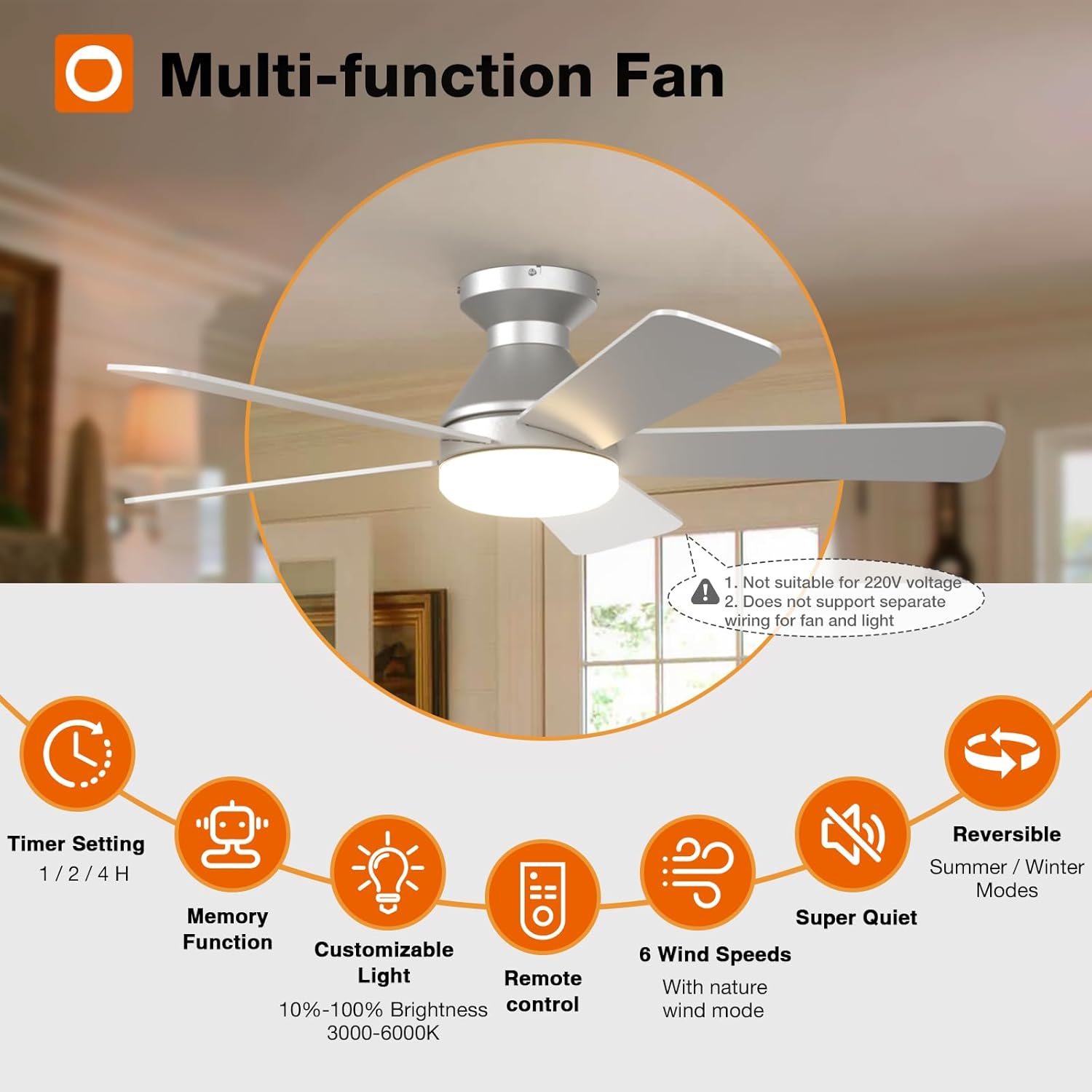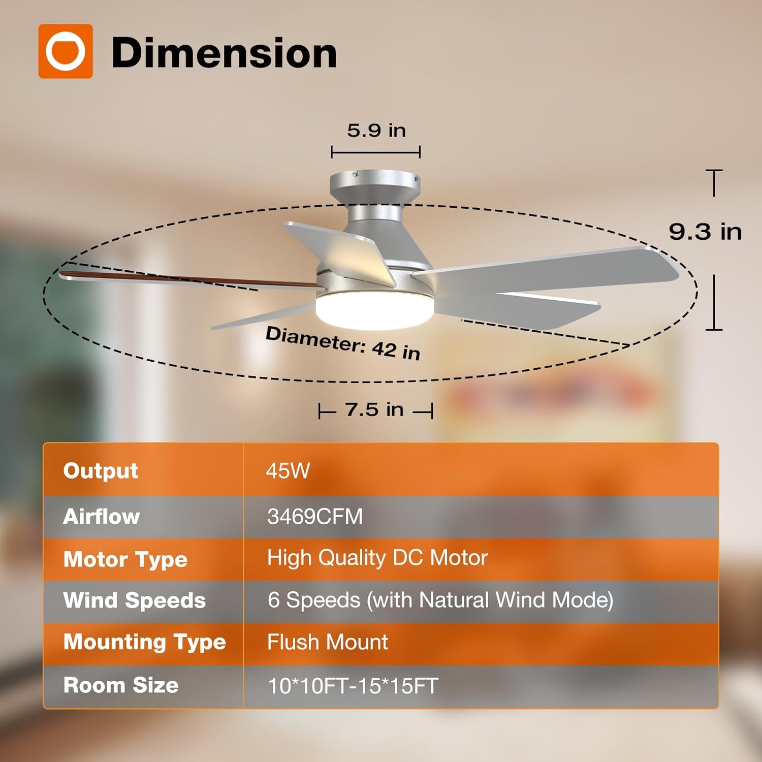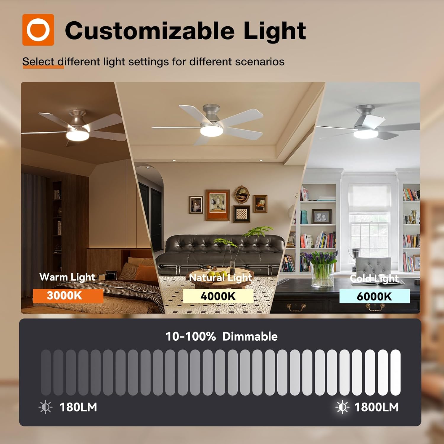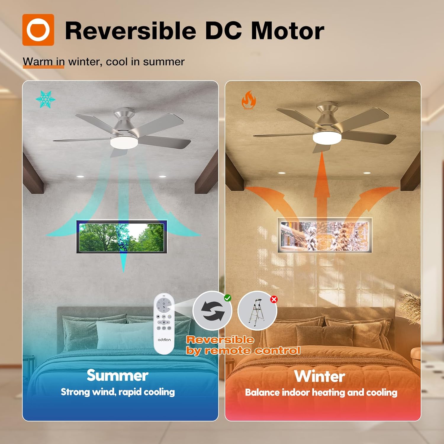 addlon Ceiling Fans with Lights, 42 Inch Low Profile Ceiling Fan with Light And Remote Control, Flush Mount, Reversible, 3CCT, Dimmable, Quiet, Nickel Small Ceiling Fan for Bedroom Indoor/Outdoor Use