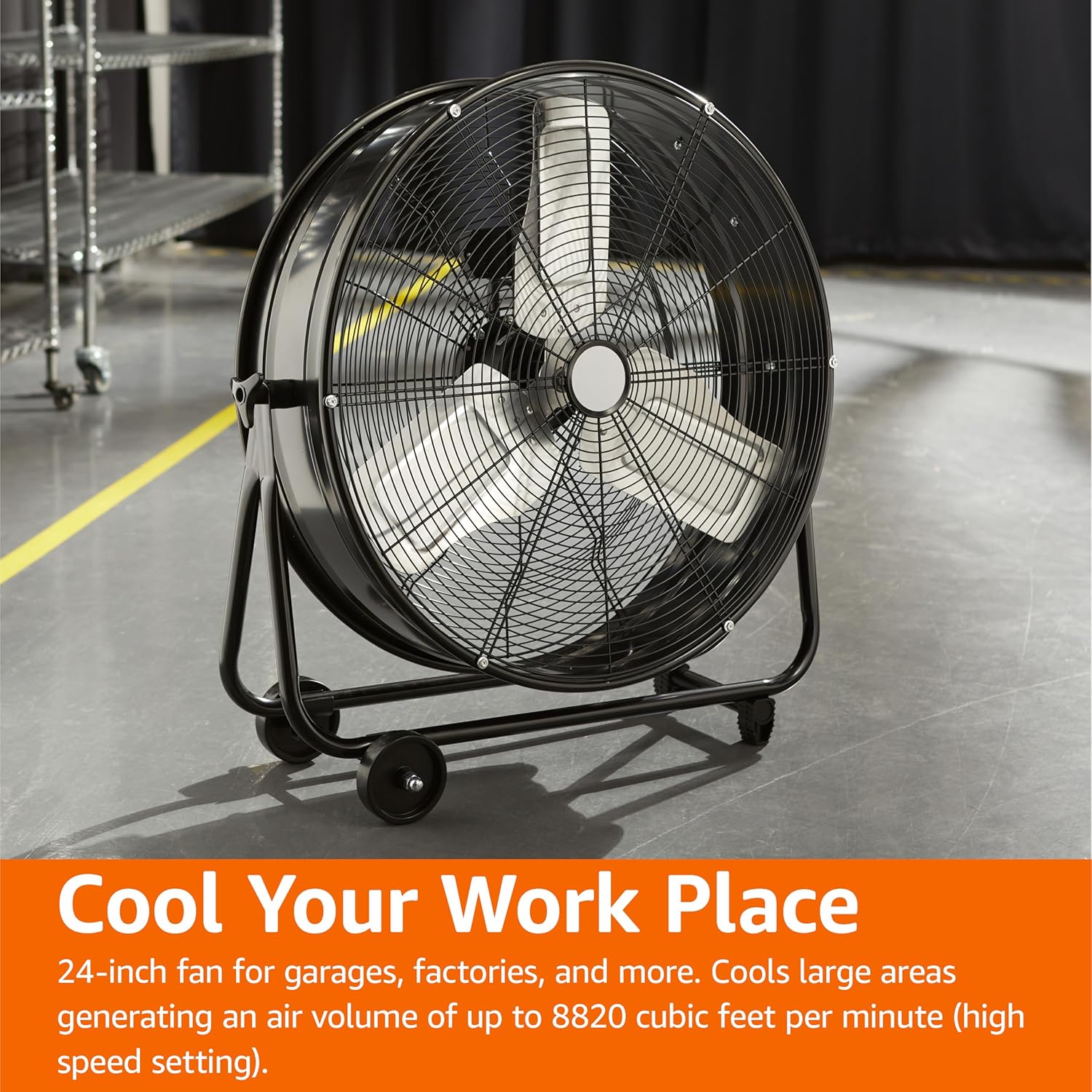 Amazon Basics 24″ 215W High-Velocity, Heavy-Duty Industrial Fan, Drum Fan, with UL-Certified Safety Compliance, 2 Speeds, Up to 8820 CFM, 5.9-ft Power Cord, 2 Wheels, Metal Housing/Blades, Black