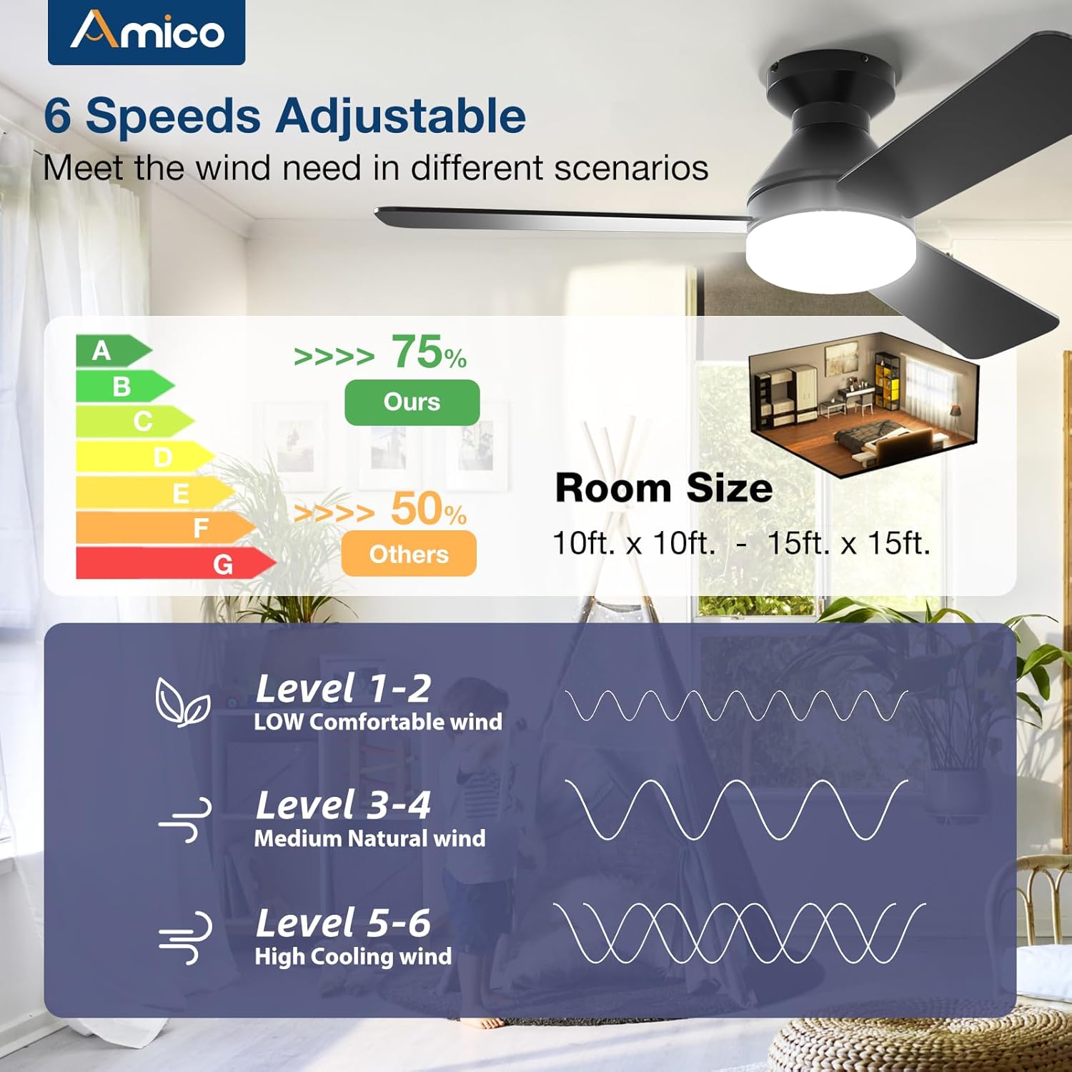 The Amico Ceiling Fan is a versatile addition to any indoor or outdoor space. With a 42-inch low profile design, it fits perfectly in bedrooms and living areas. This fan features a remote control for convenient operation, allowing you to adjust settings from anywhere in the room. It offers 6 speed options and customizable lighting with a dimmable feature, ensuring you can create the perfect ambiance. Additionally, the fan has a memory function that remembers your last settings for added convenience.