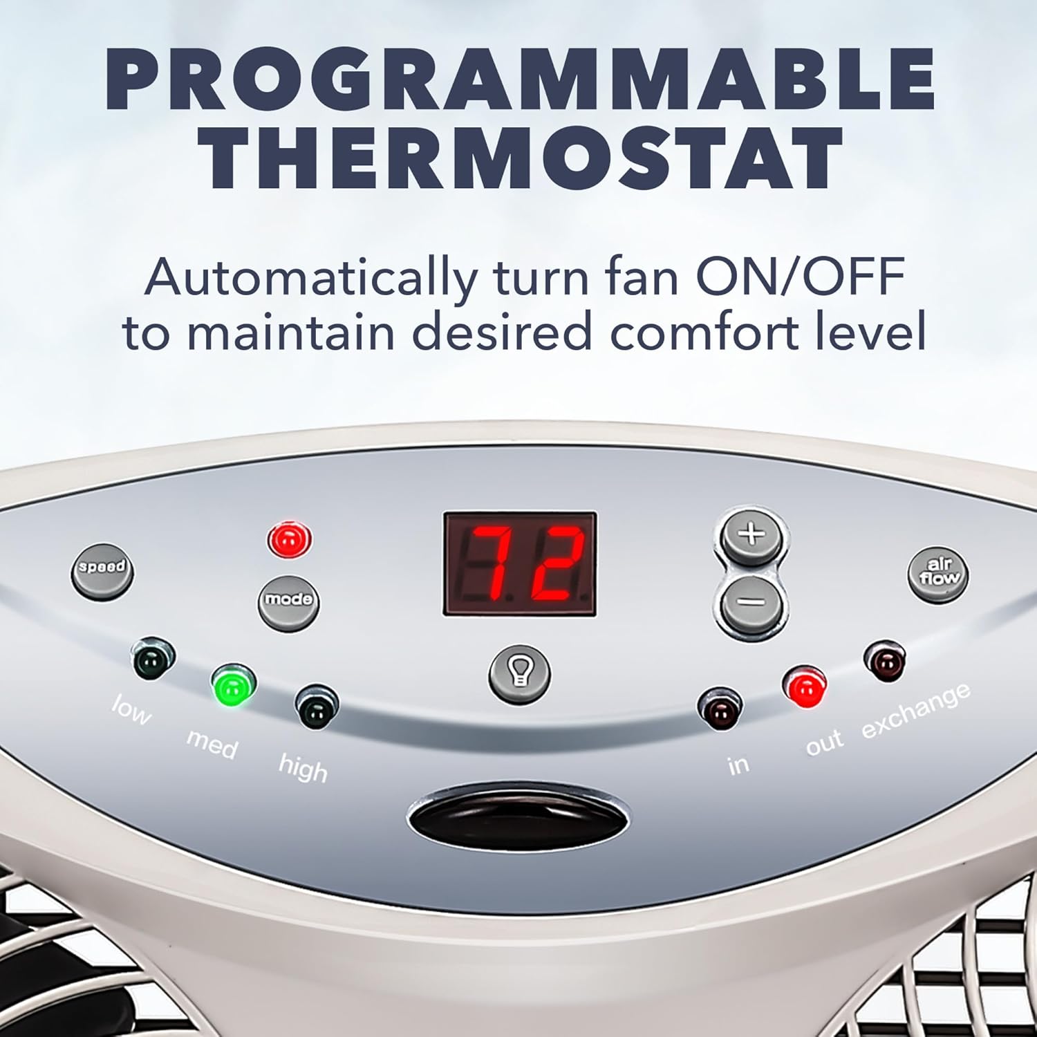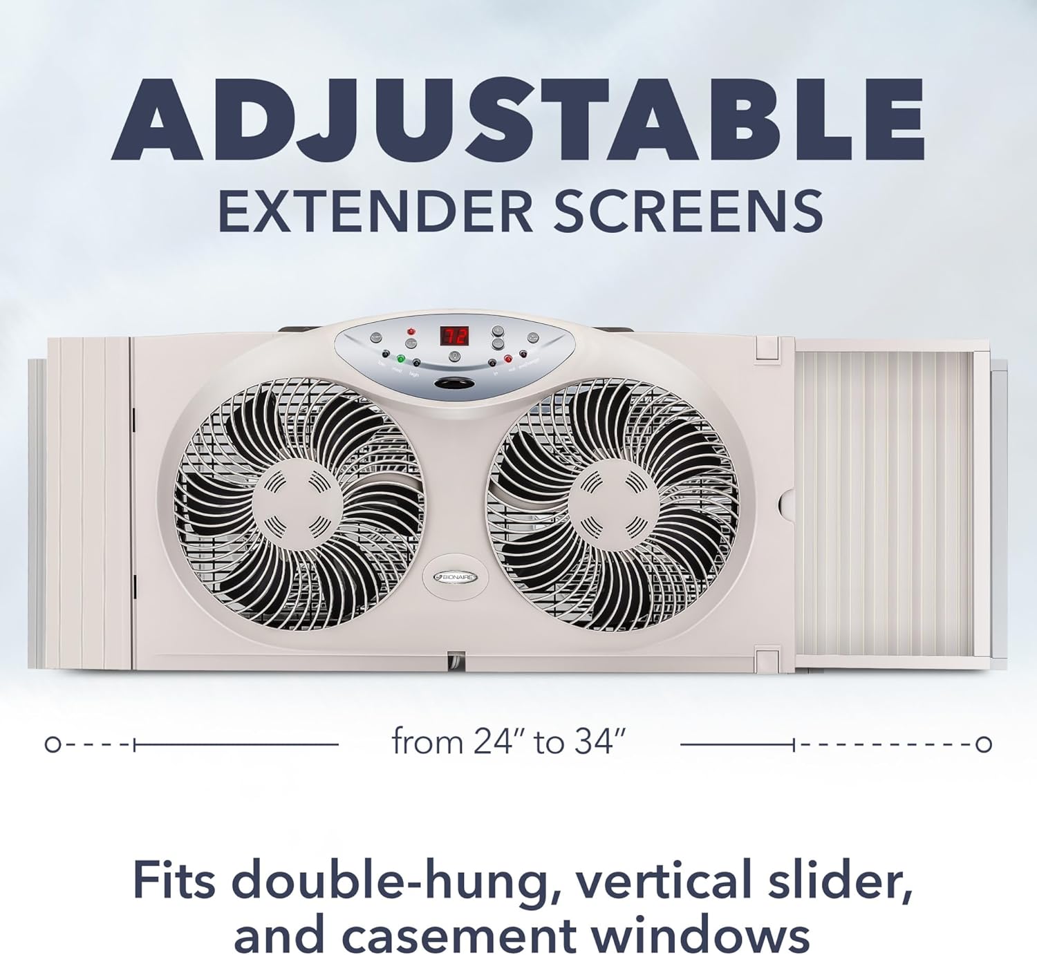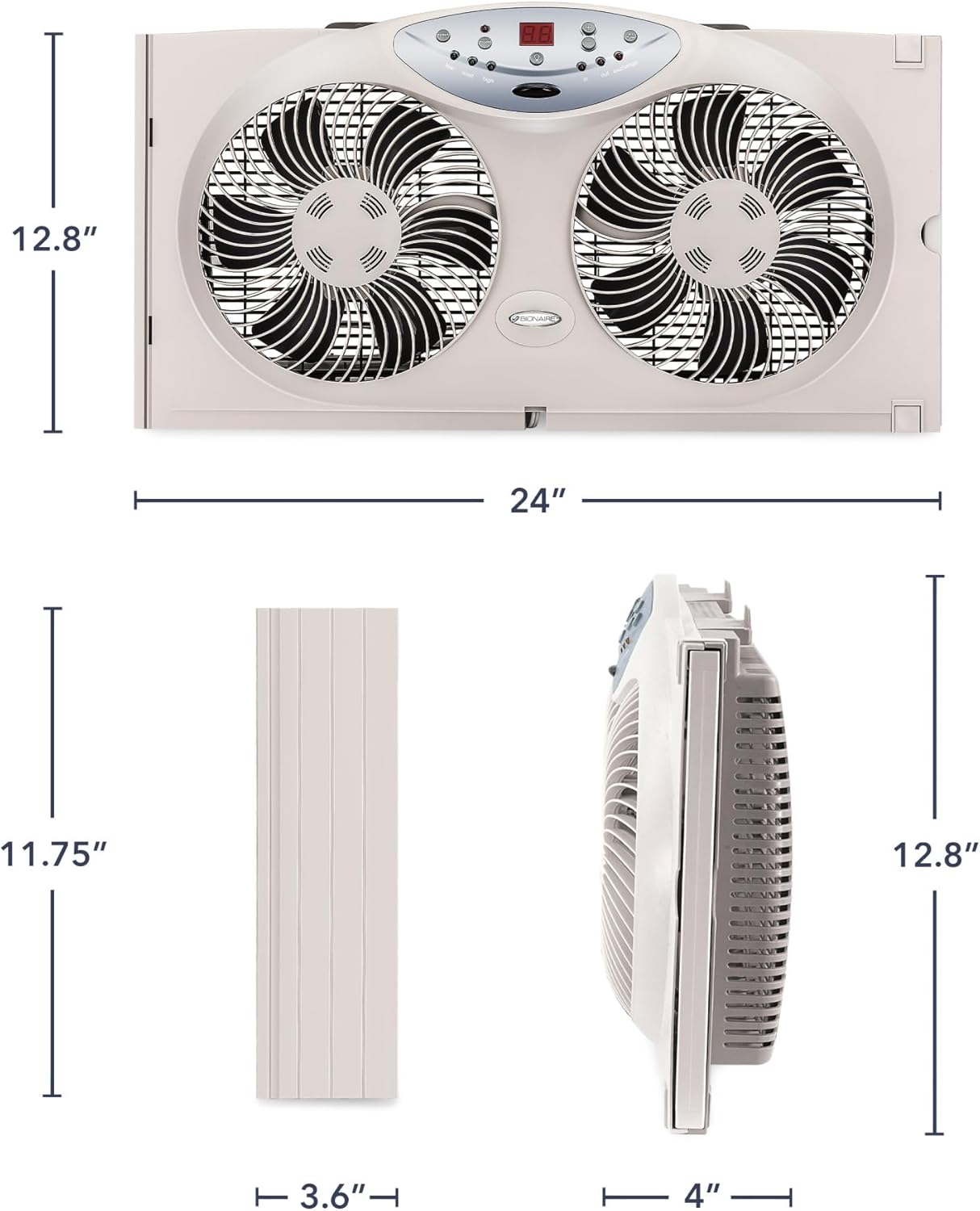 Additionally, the programmable thermostat helps maintain your desired temperature by turning the fan on and off as needed. This fan fits various window types, including double-hung and vertical slider windows, with extenders for a custom fit. Overall, its height is 13 inches, and each fan measures 8.5 inches.