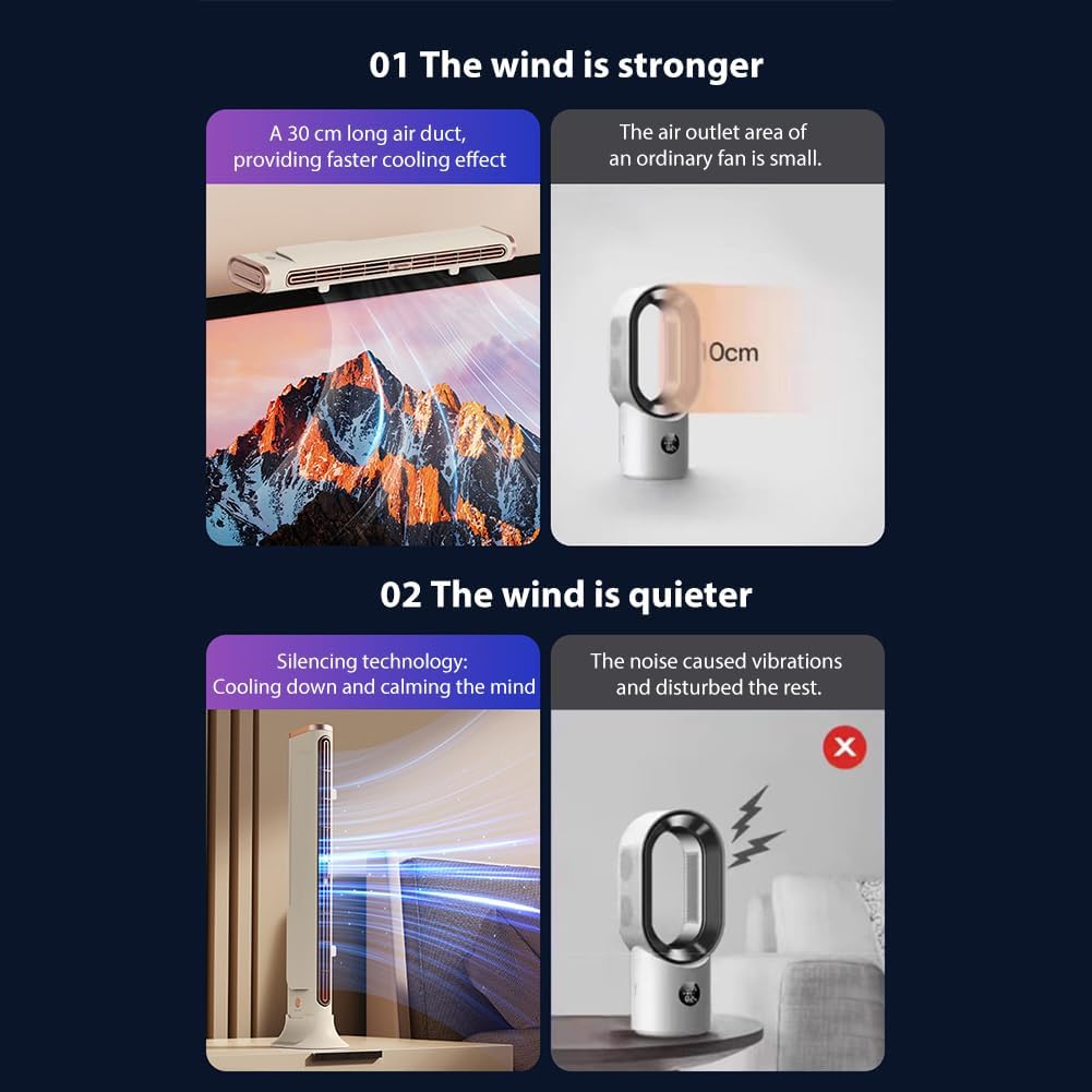 The Bladeless Tower Fan is designed for energy efficiency and convenience. With a power consumption of just 5W and a safe DC5V input voltage, it helps reduce energy costs while providing effective cooling. Its slim structure, measuring 37cm in height and only 7cm in width, allows it to fit seamlessly into any space, whether it’s on a desk or hung on a monitor. Made from durable ABS+PC materials, this fan is both impact and high-temperature resistant, ensuring longevity. The gentle wide-angle airflow, coupled with ultra-quiet operation below 30dB, makes it perfect for use in bedrooms, libraries, or offices where noise levels need to be kept low.
