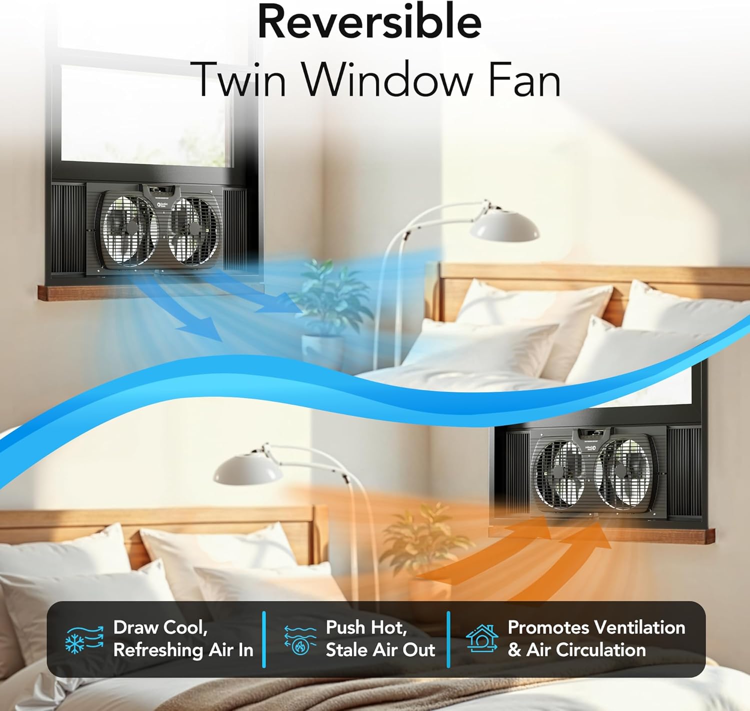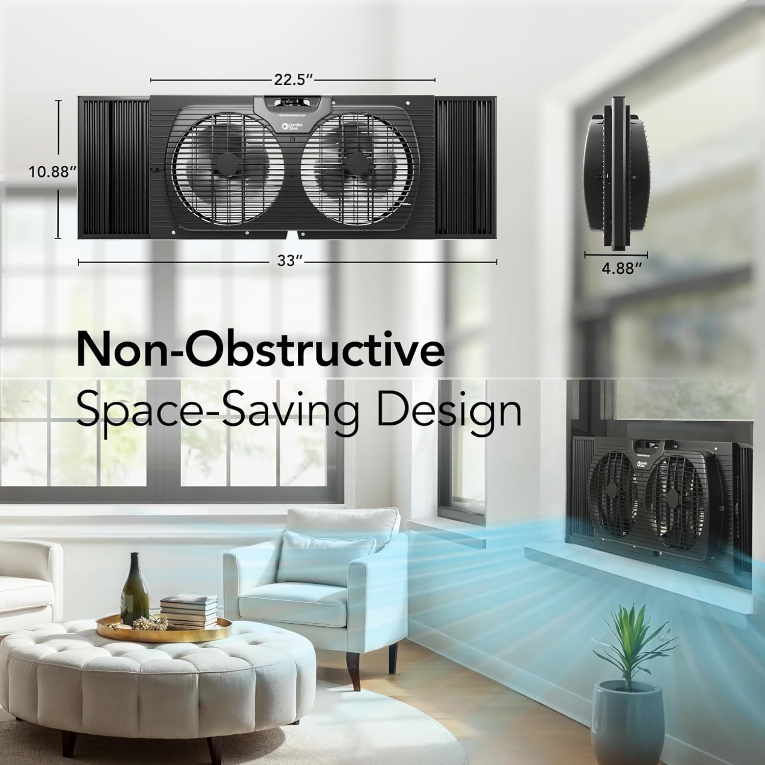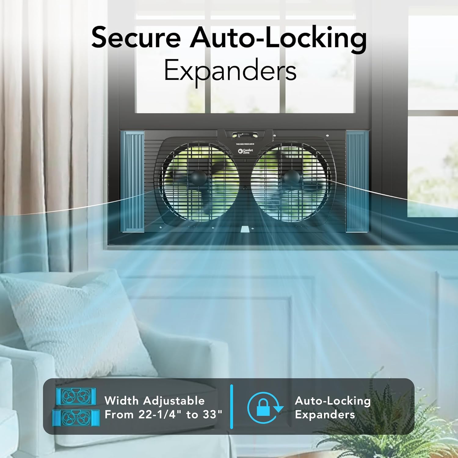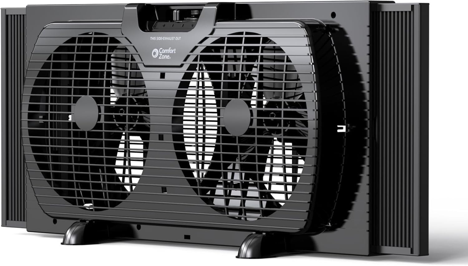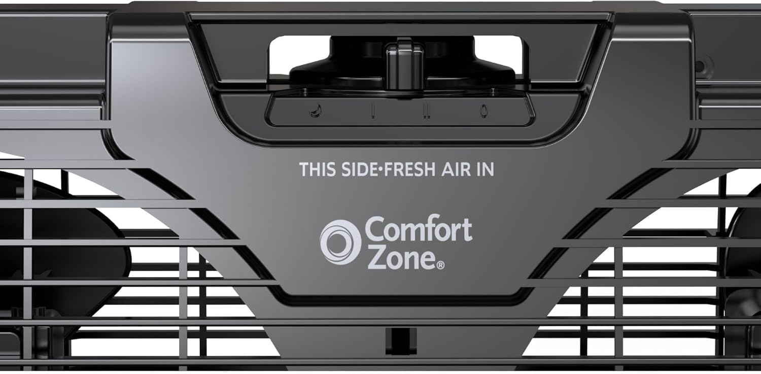 The Comfort Zone Window Fan is designed to enhance air circulation in your home effectively. With a 3-speed airflow output, you can easily adjust the fan settings using the manual dial to create a comfortable environment. The twin fan design not only provides a stronger breeze but also helps in circulating fresh air throughout your space. Additionally, it features auto-locking expanders that fit windows between 22-1/4" and 33" wide, ensuring a secure installation. The reversible exhaust function allows you to push out hot air, making it particularly useful during warm, humid days.