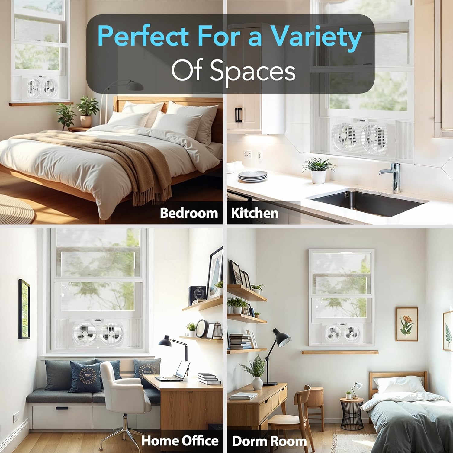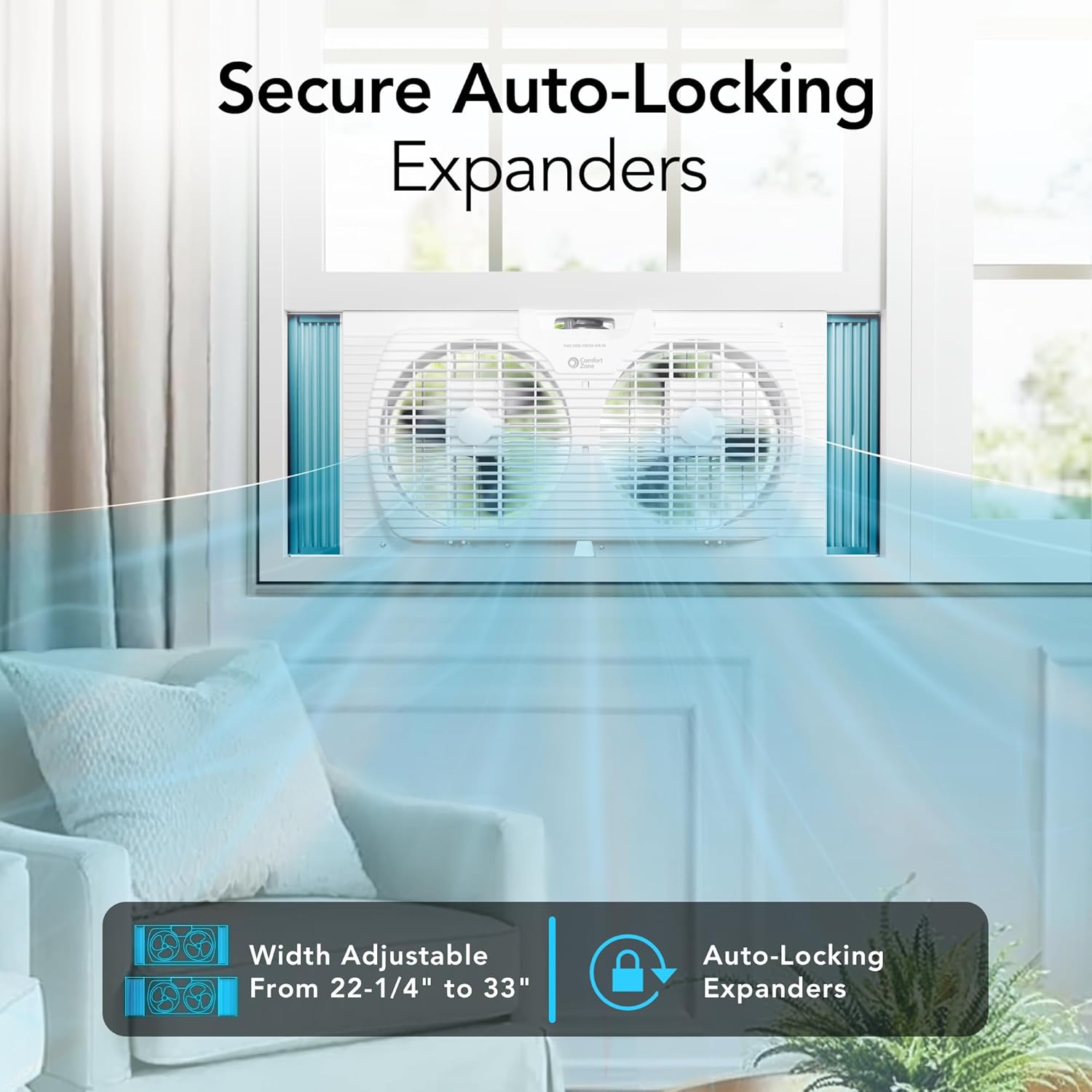 Comfort Zone Window Fan for Bedroom, 9 inch 3 Speed Dual Fans with Auto-Locking Expanders, Window Exhaust Fan, Removeable Bug Screen, White