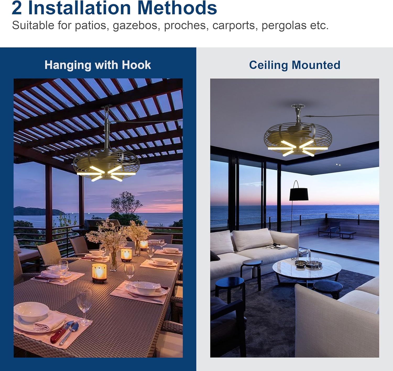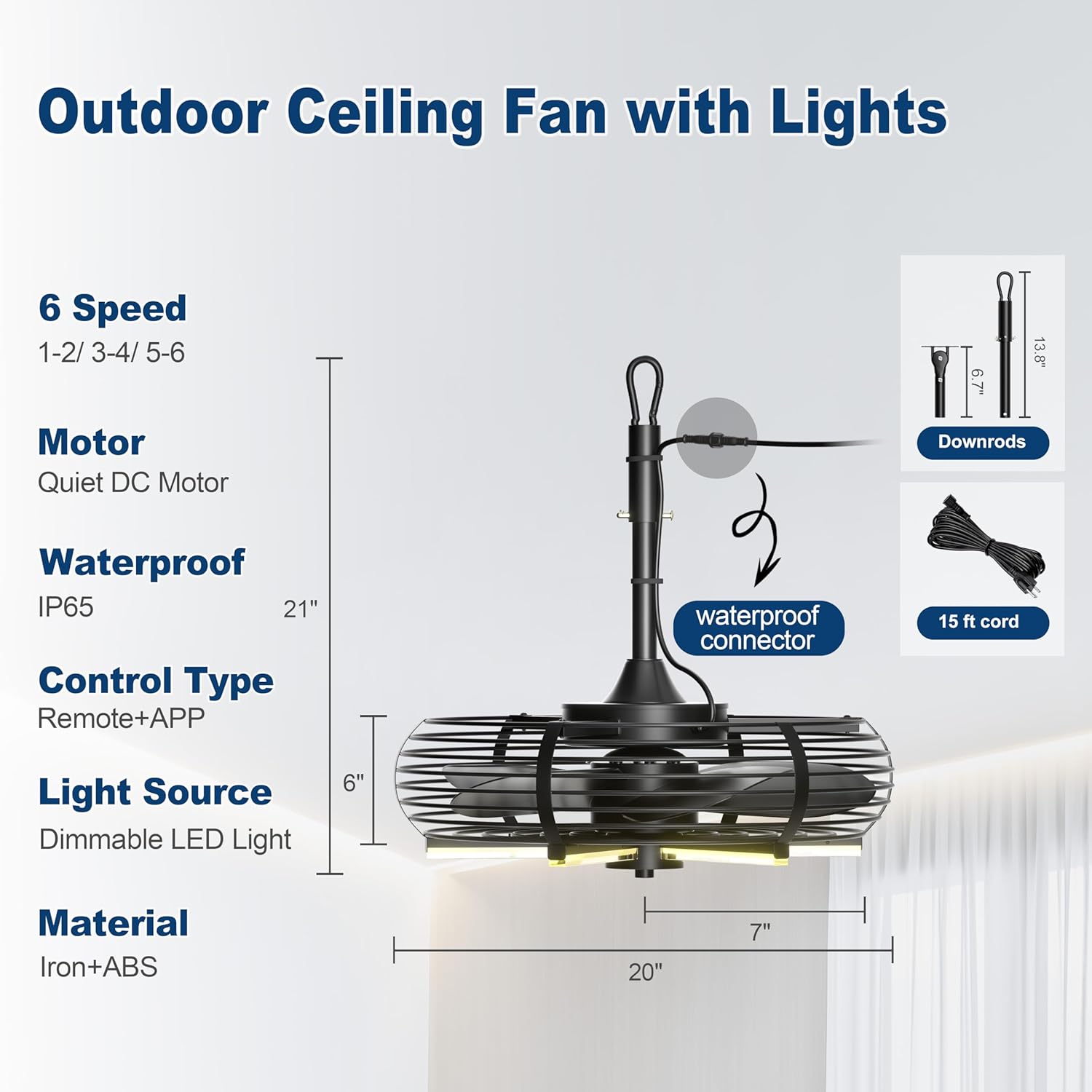 Coolbull Outdoor Ceiling Fans with Light for Patios, 20” Gazebo Fan, Plug in Ceiling Fan, Waterproof, Remote&APP Control, Hanging with Hook, Black