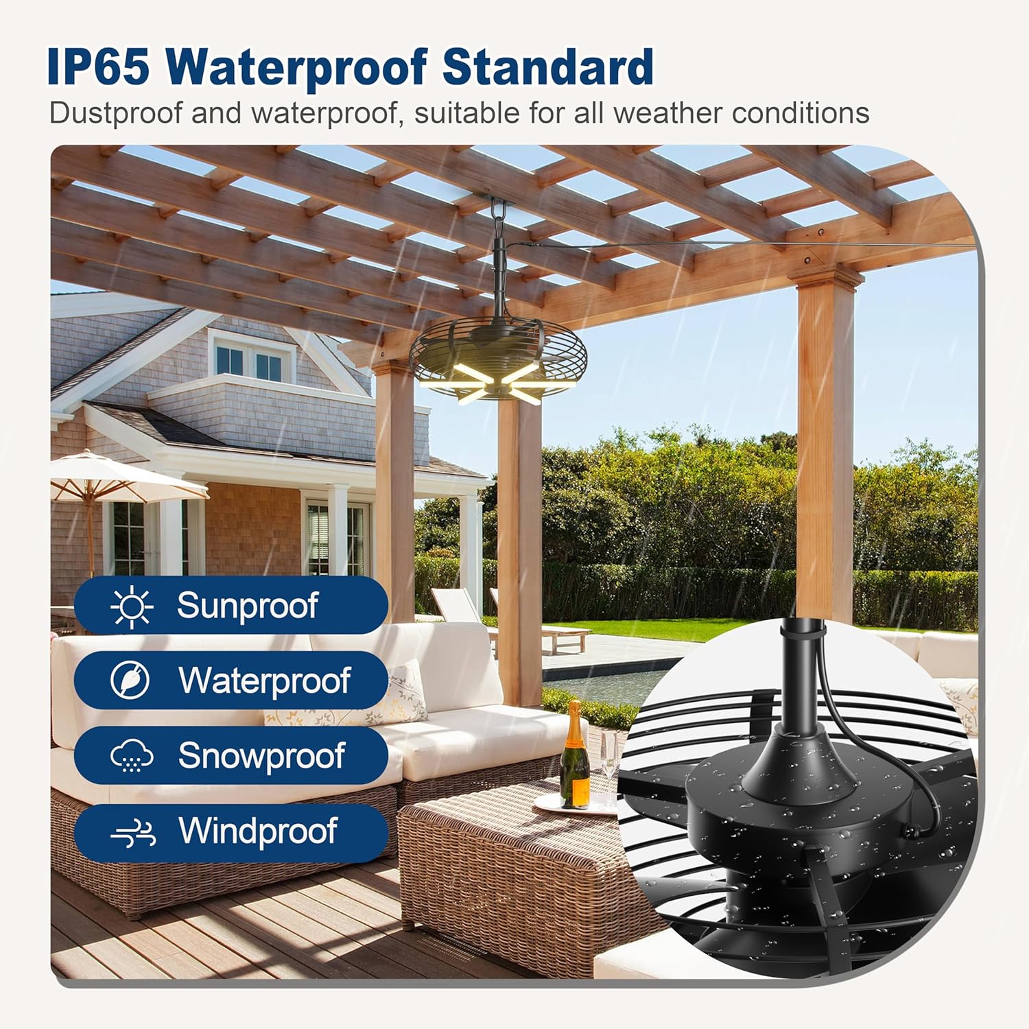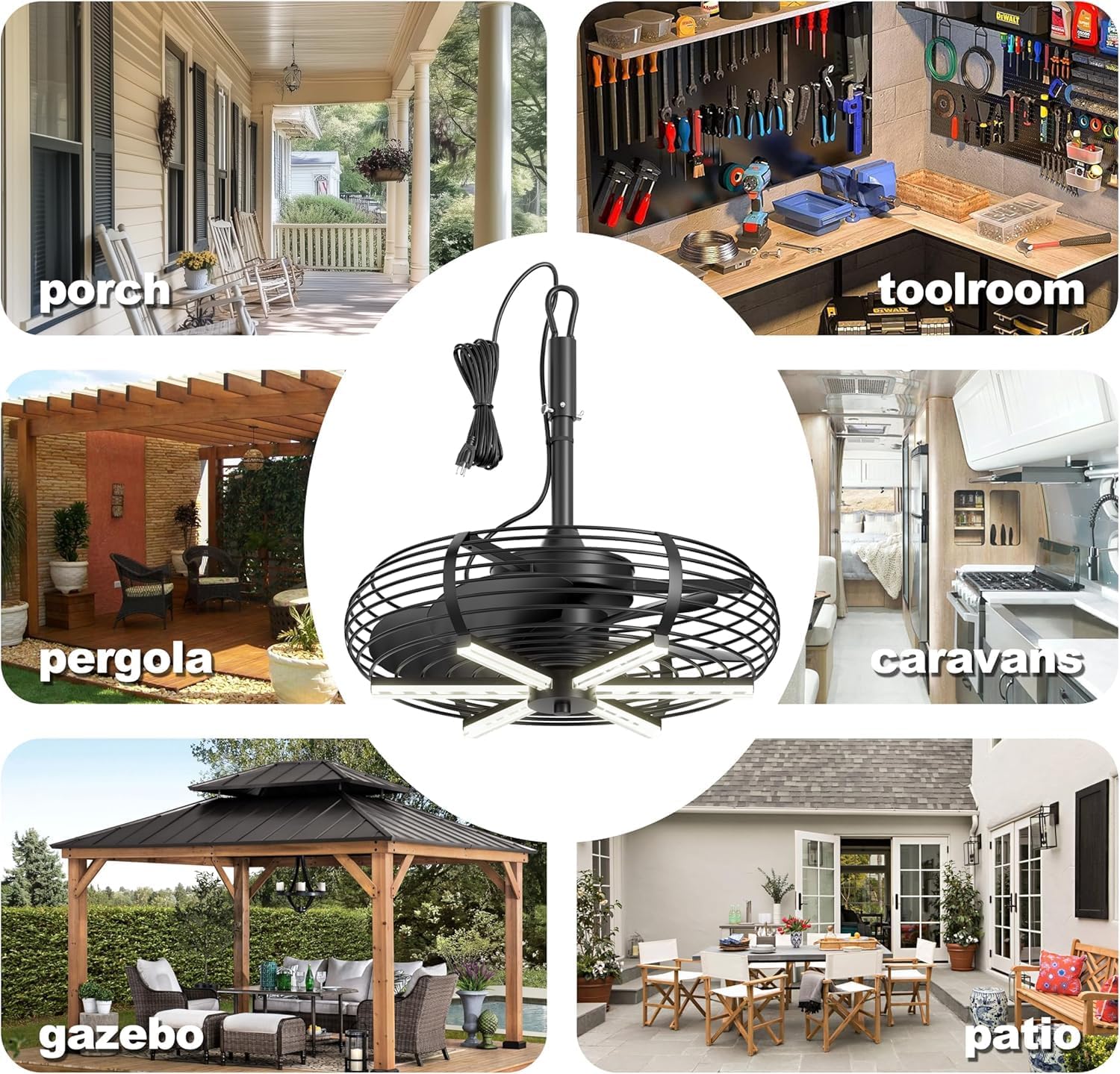 The Coolbull 20" plug-in ceiling fan is your ideal outdoor cooling solution, designed for convenience and versatility. With no wiring needed, simply hang it up and plug it in using the 15-foot cord, making it perfect for patios, porches, and even camping. This fan is built to withstand the elements, featuring an IP65 rating for waterproofing and heat resistance. Its whisper-quiet operation, as low as 35dB, ensures a peaceful environment while you enjoy the breeze.