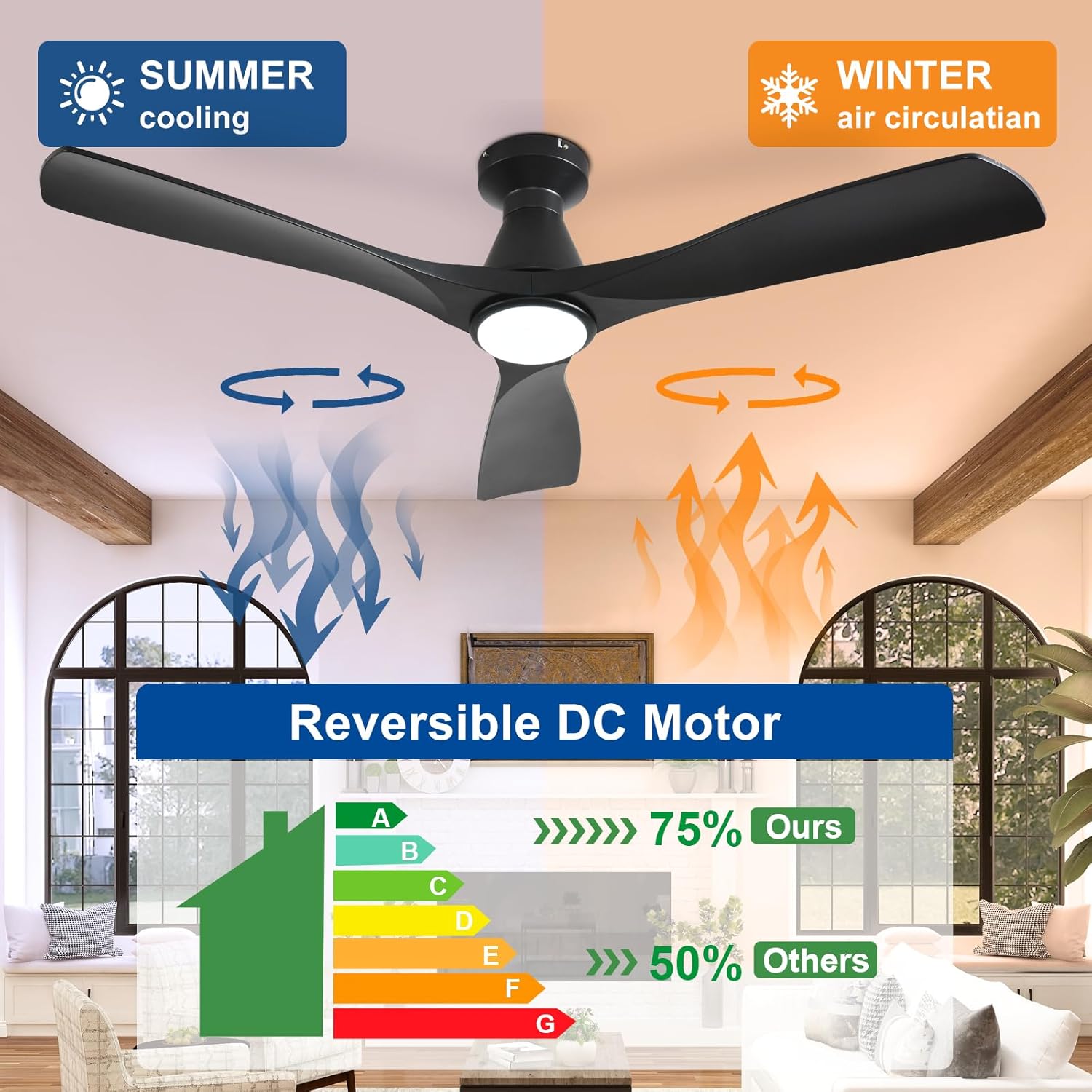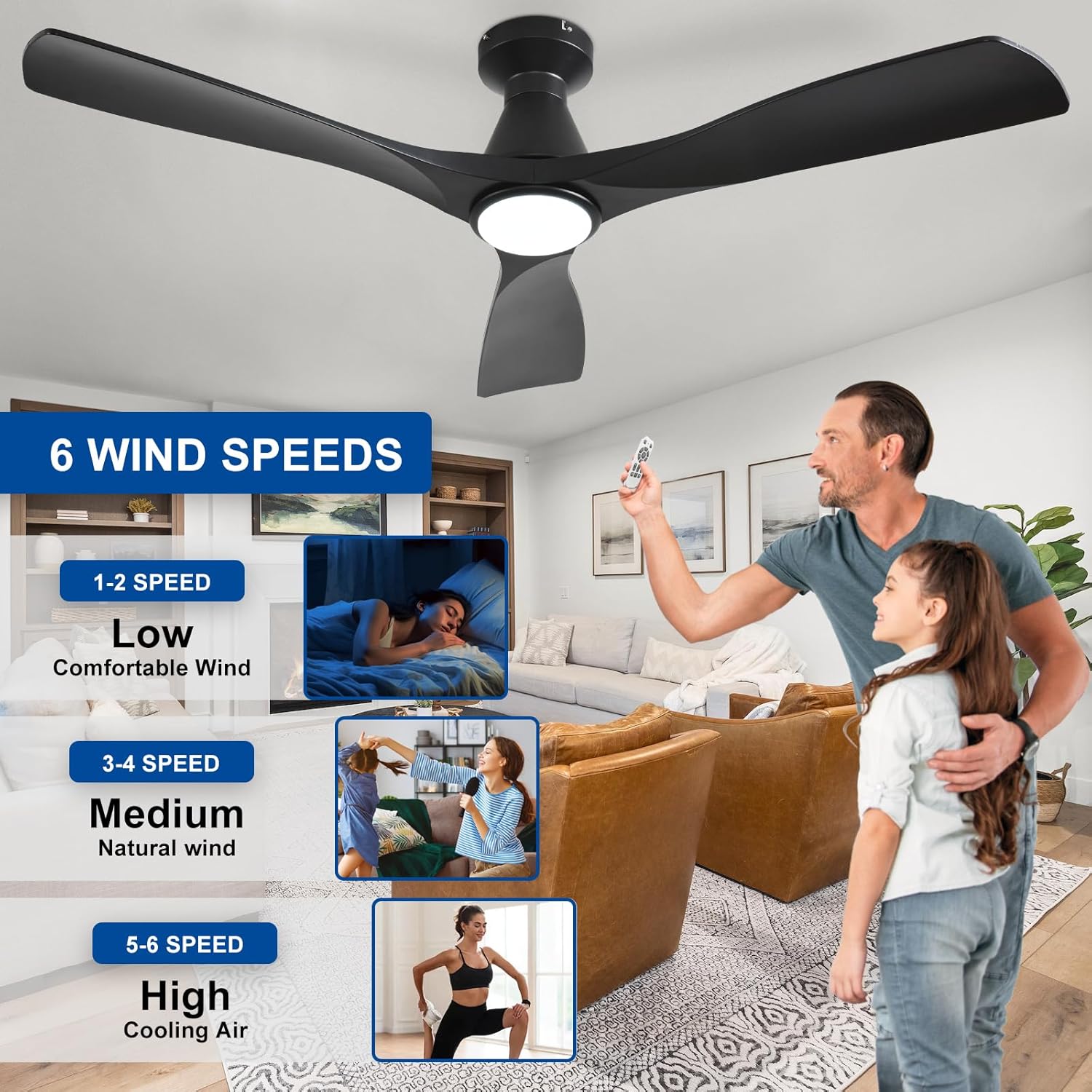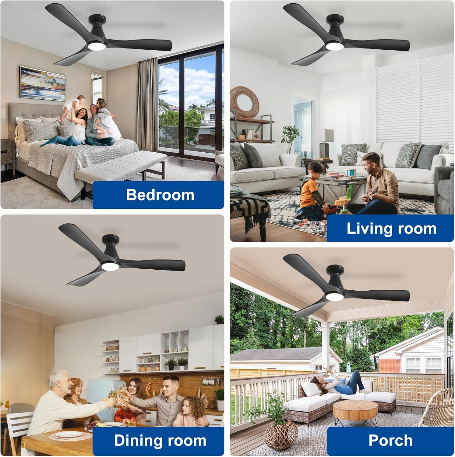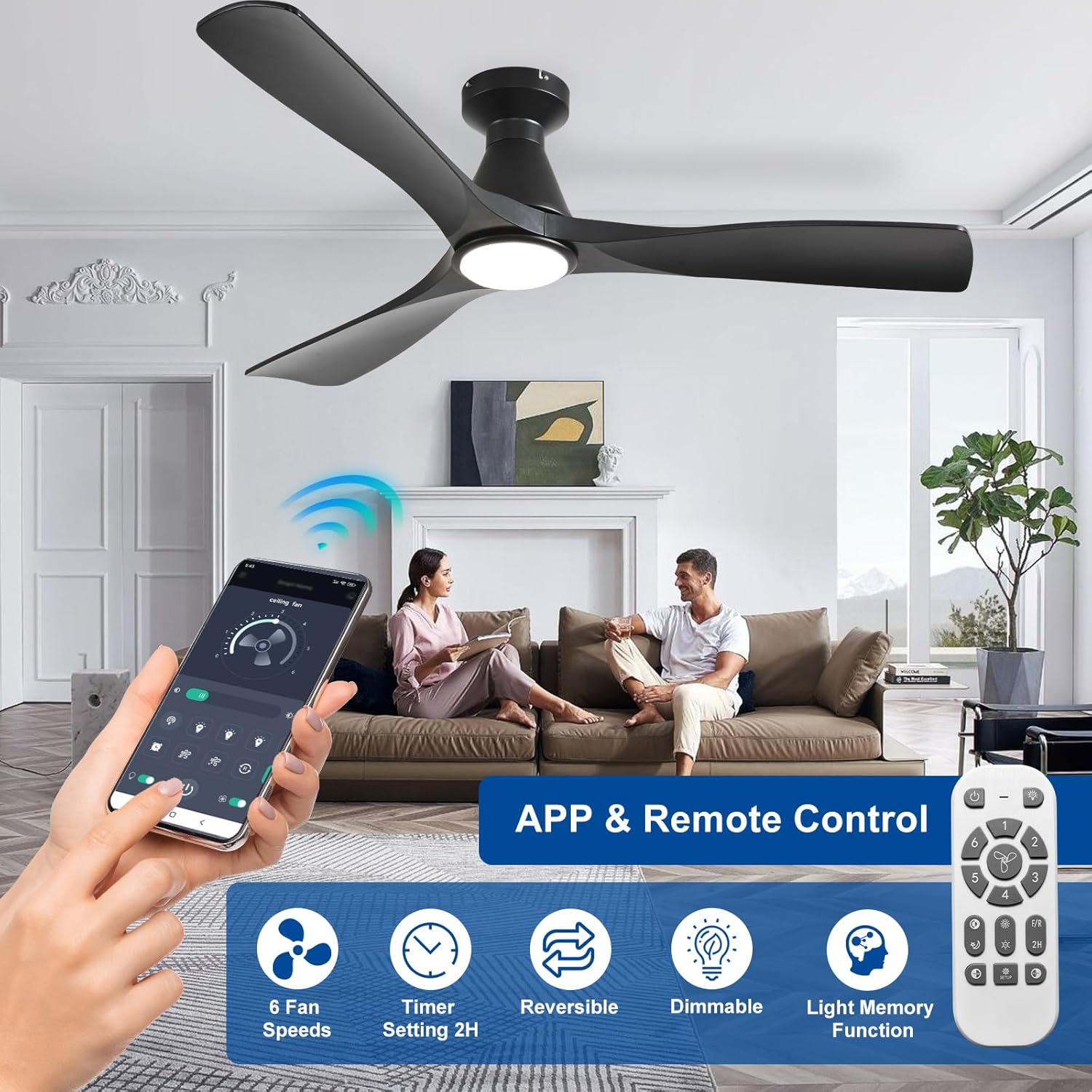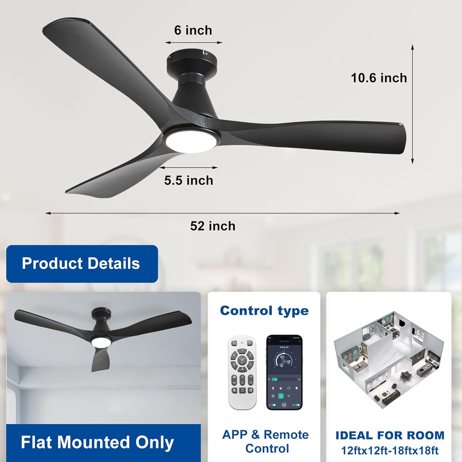 Depuley 52-Inch Ceiling Fans with Lights: Black 3 Blade Flush Mount Low Profile Ceiling Fan for Bedroom – Dimmable Indoor Outdoor Fan with Remote APP Control Ultra Quiet DC Motor Timer