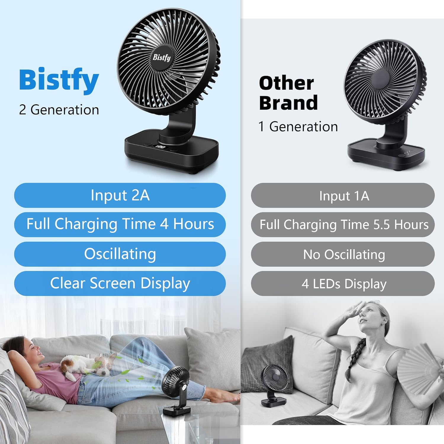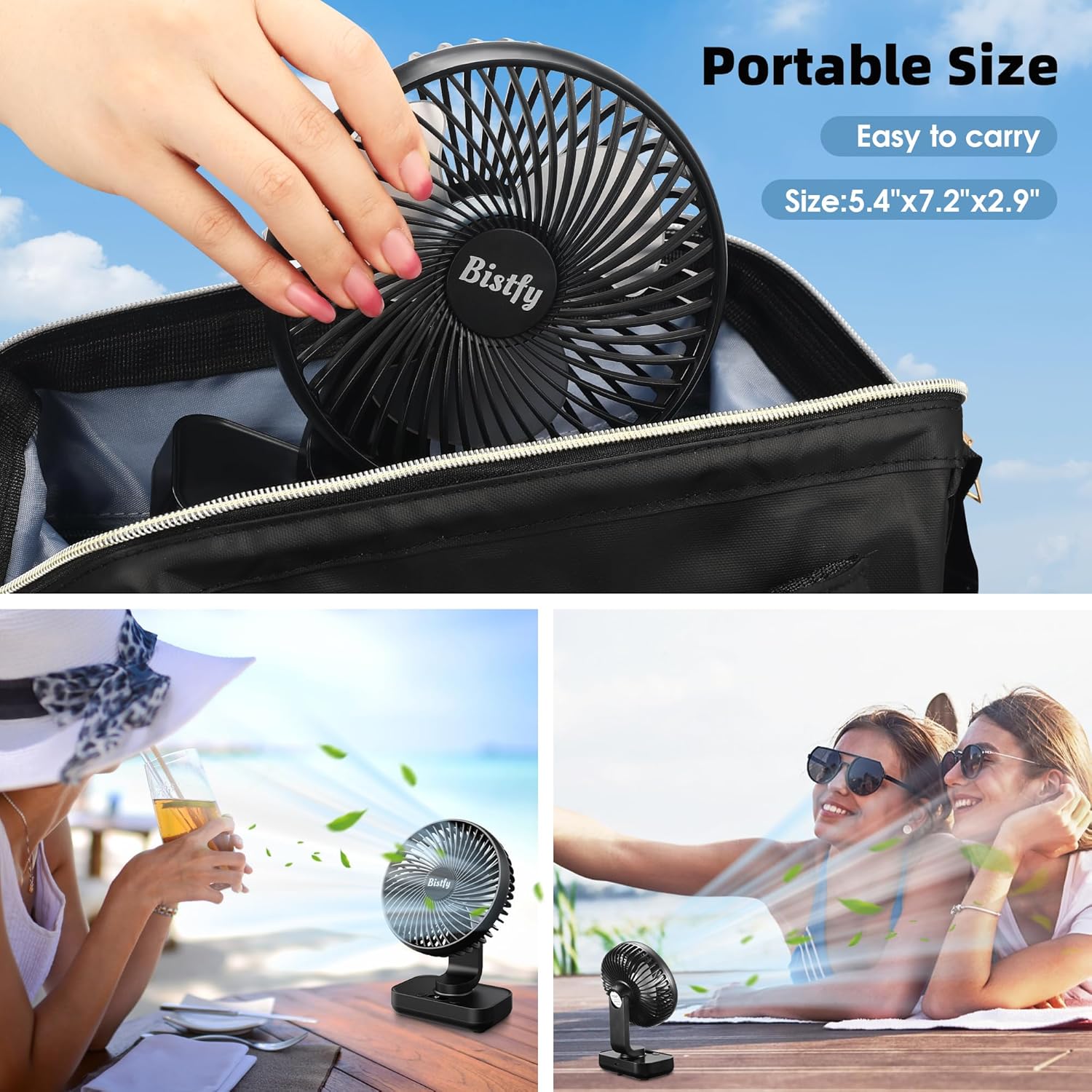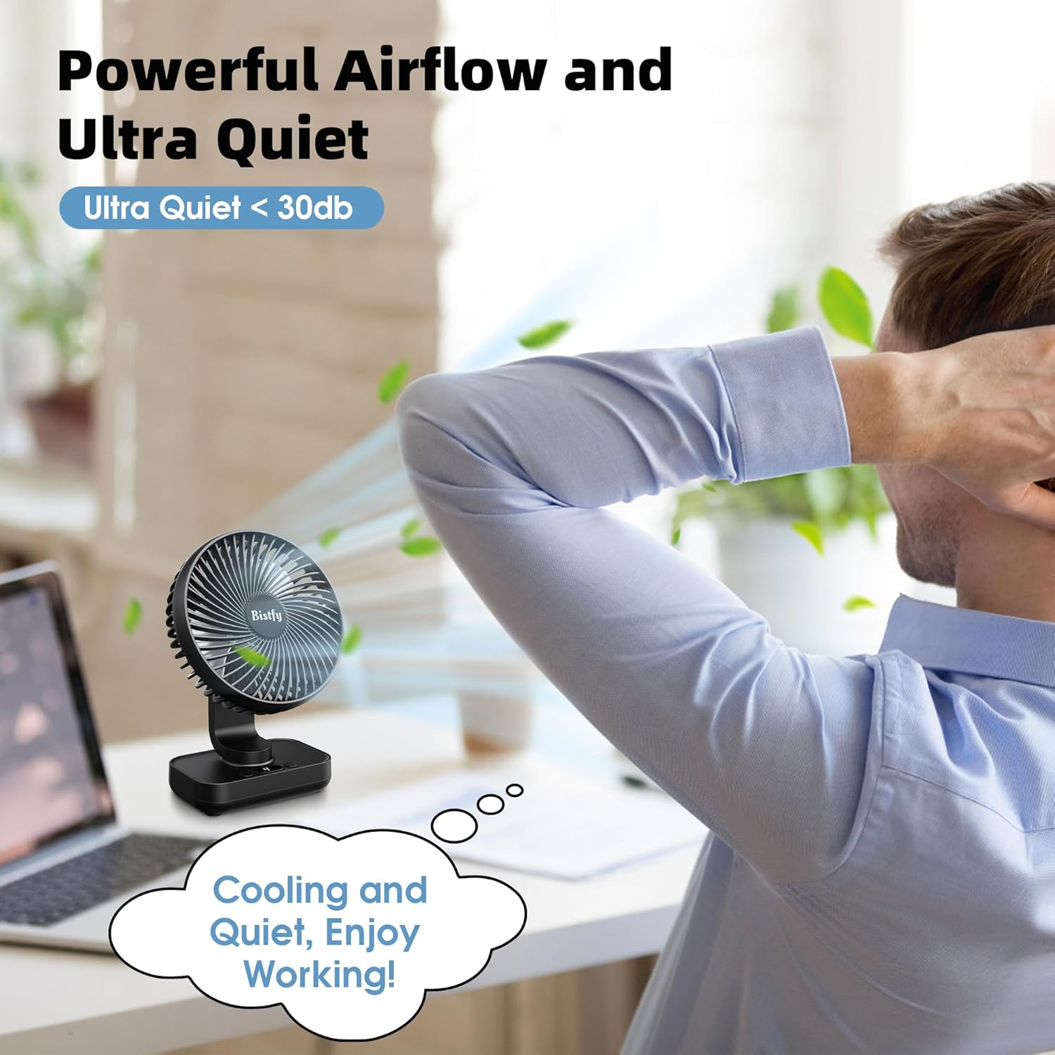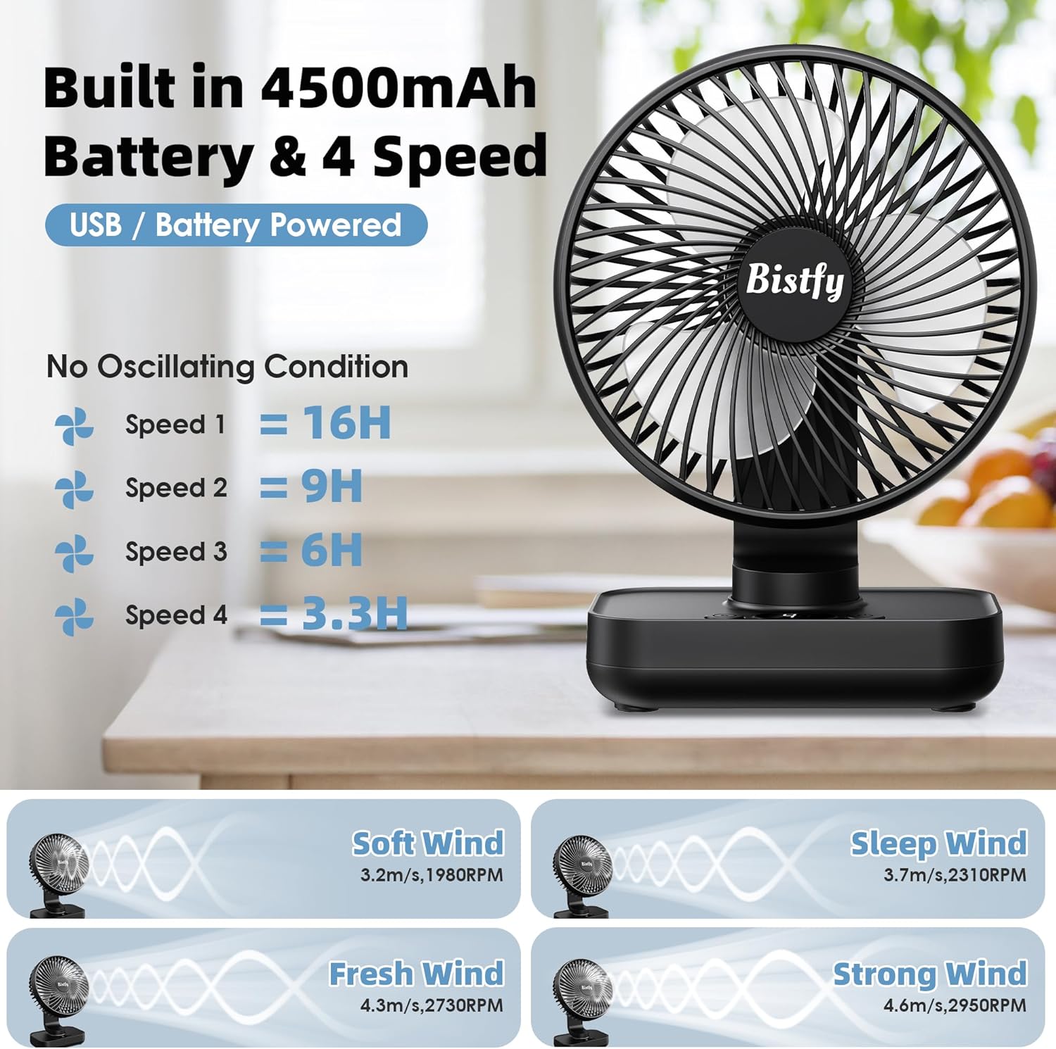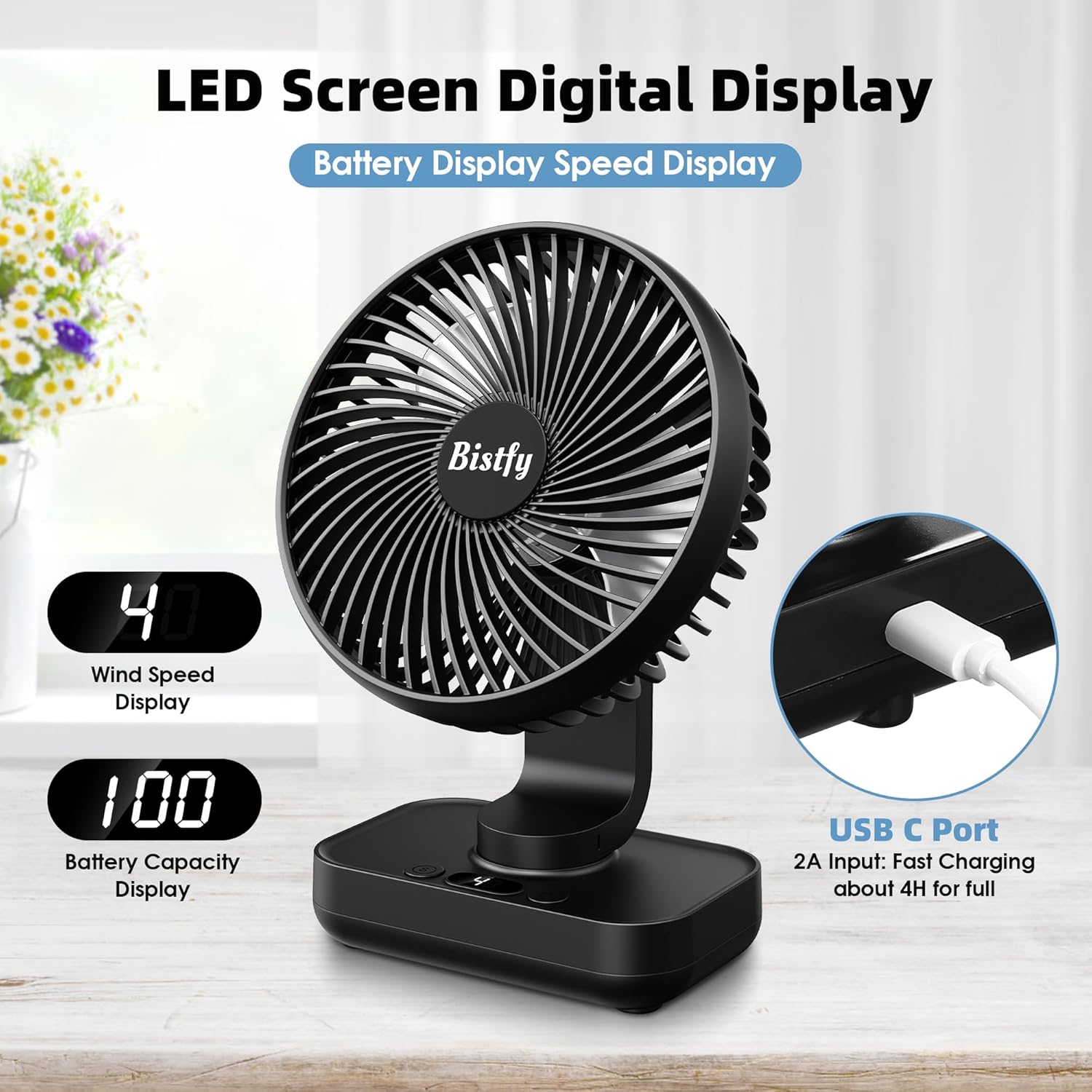 The Desk Fan 5.5'' is designed for versatile use, making it an ideal choice for home, office, or travel. With its ultra-silent operation, it ensures a peaceful environment while providing effective cooling. The fan features a 120° oscillation and a 90° adjustable head tilt, allowing you to direct airflow exactly where you need it. Additionally, the digital display and four-speed settings offer customizable comfort. The 4500mAh rechargeable battery ensures portability, making it easy to use without being tethered to an outlet.