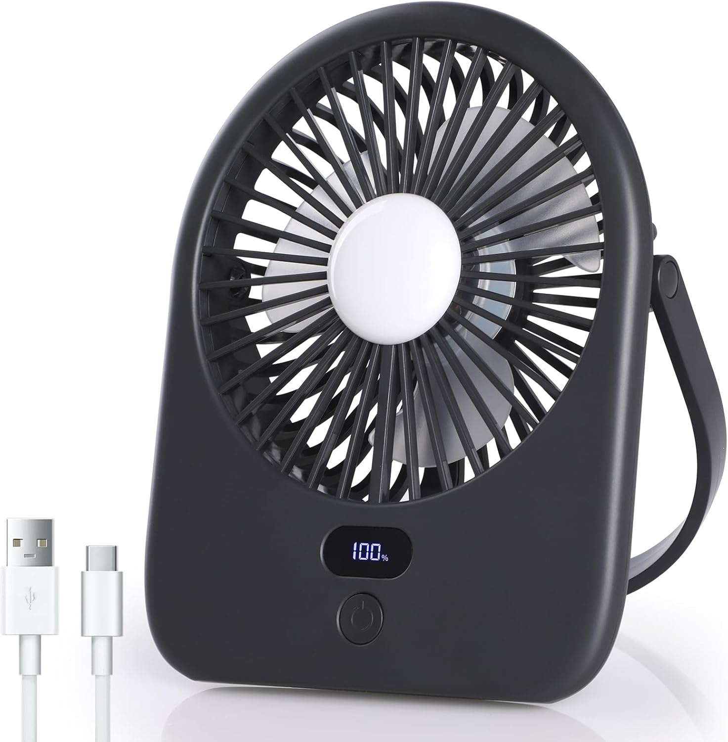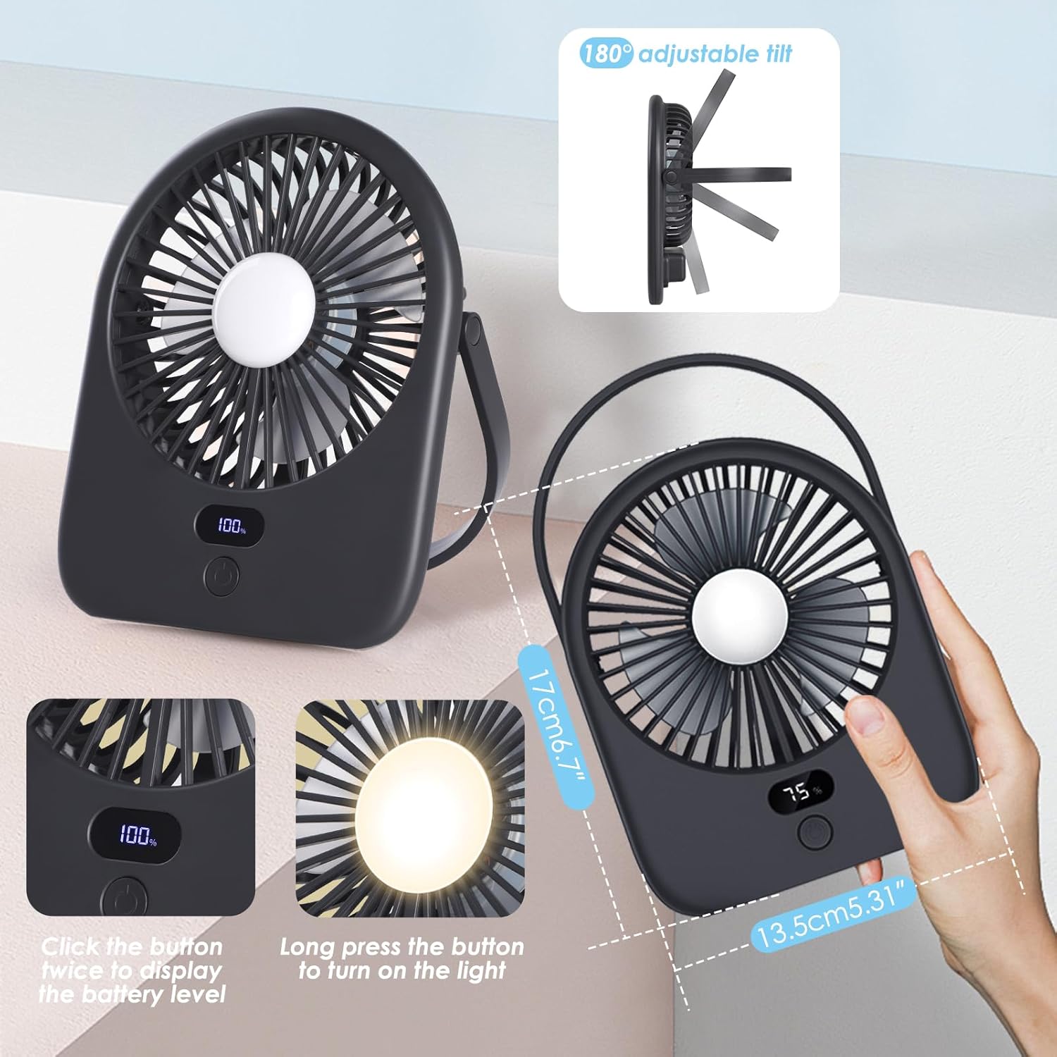 Desk Fan with LED Light – 5 Speed Adjustable,Rechargeable USB Table Fan with Power Display, 180° Adjust,Quiet Personal Fan for Office, Bedroom, Home (Grey)