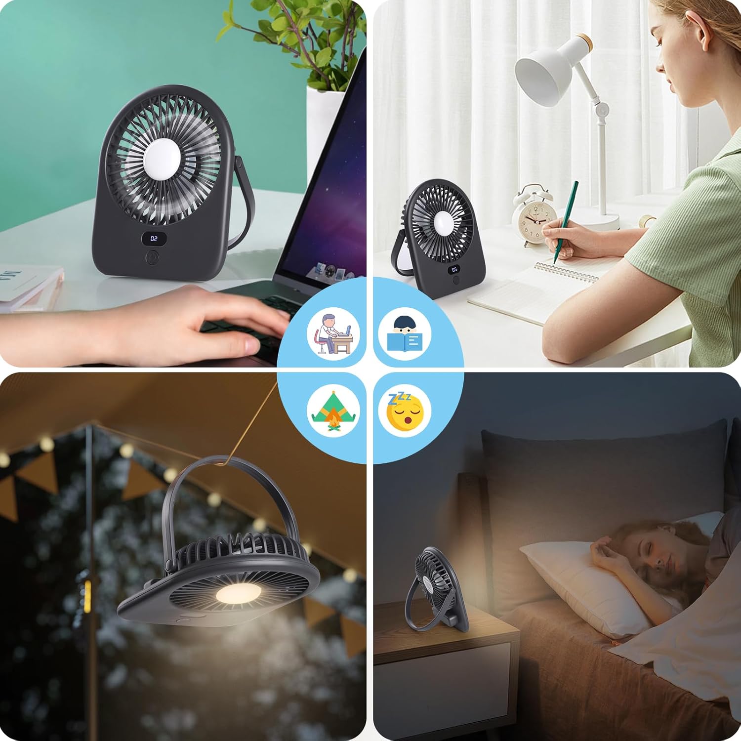 This fan is perfect for office workspaces, bedrooms, study desks, and even camping trips.