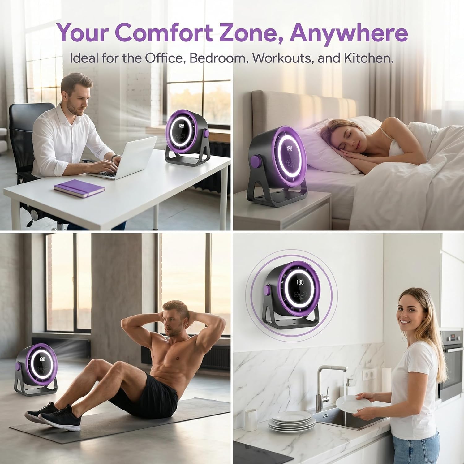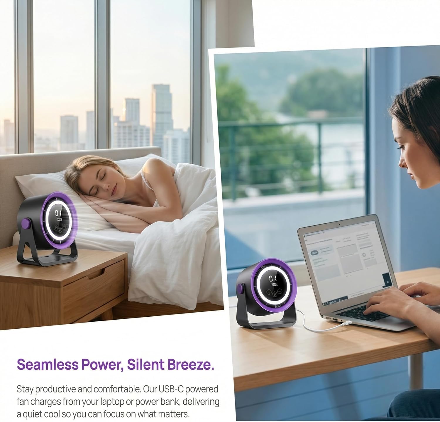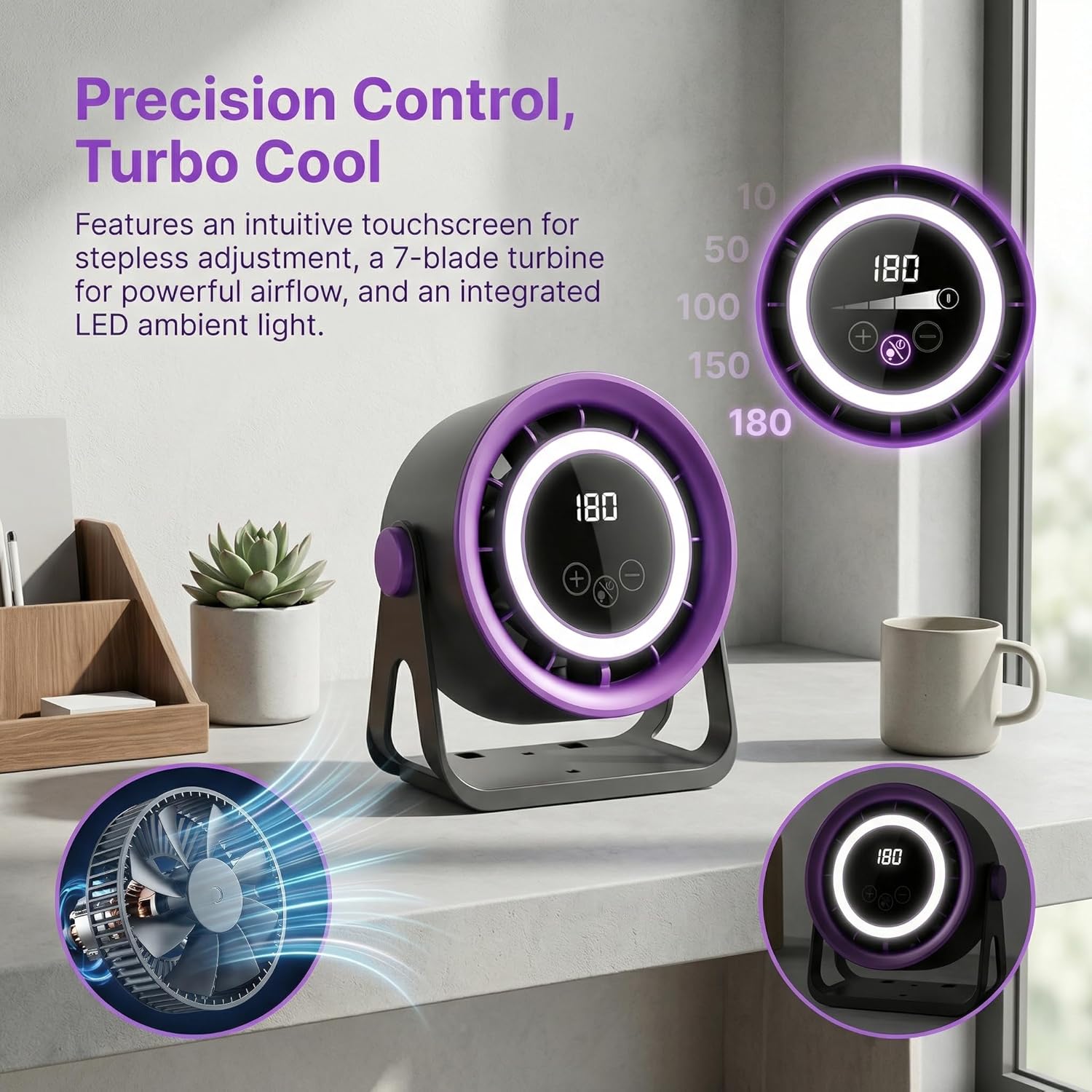 This USB rechargeable desk fan is designed for versatility and convenience. With a compact size, it fits perfectly on your desk, bedside table, or camping site. The fan features 5 stepless speed levels, allowing you to adjust the airflow to your preference. It also includes a touch control for easy operation and an LED display for visibility. The 360° tilt function ensures that you can direct the airflow wherever you need it most. Additionally, it has a built-in night light, making it a great addition to your bedroom or office.