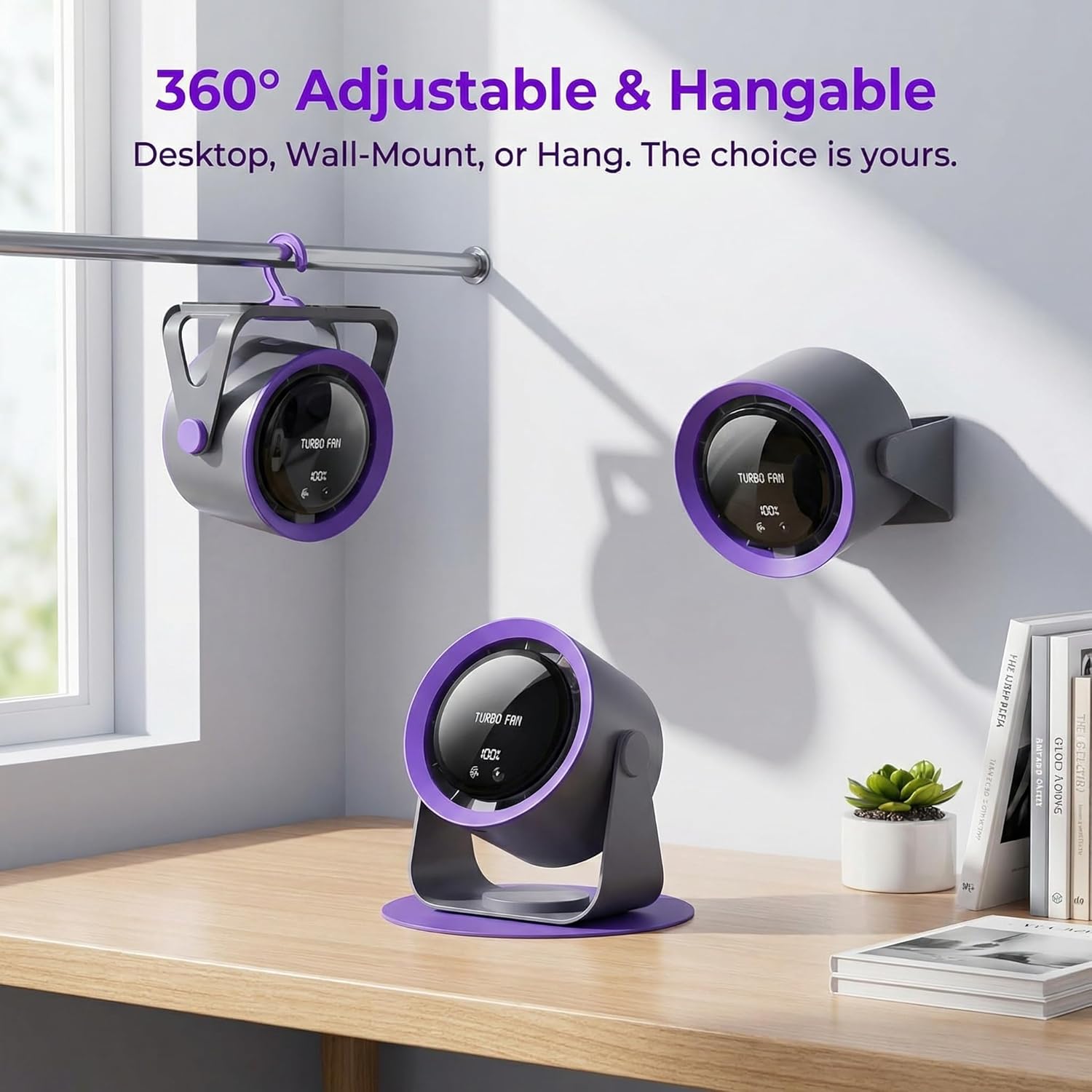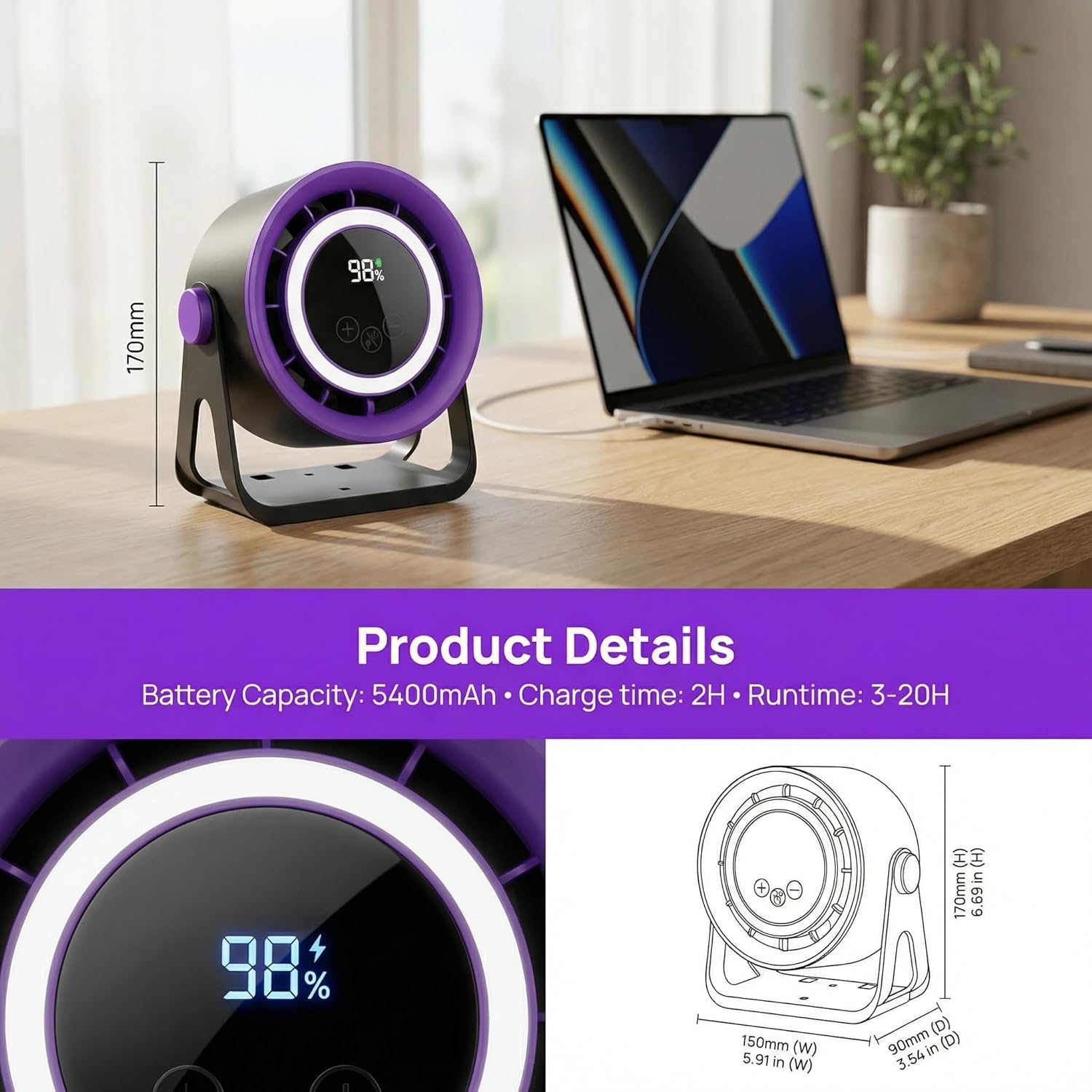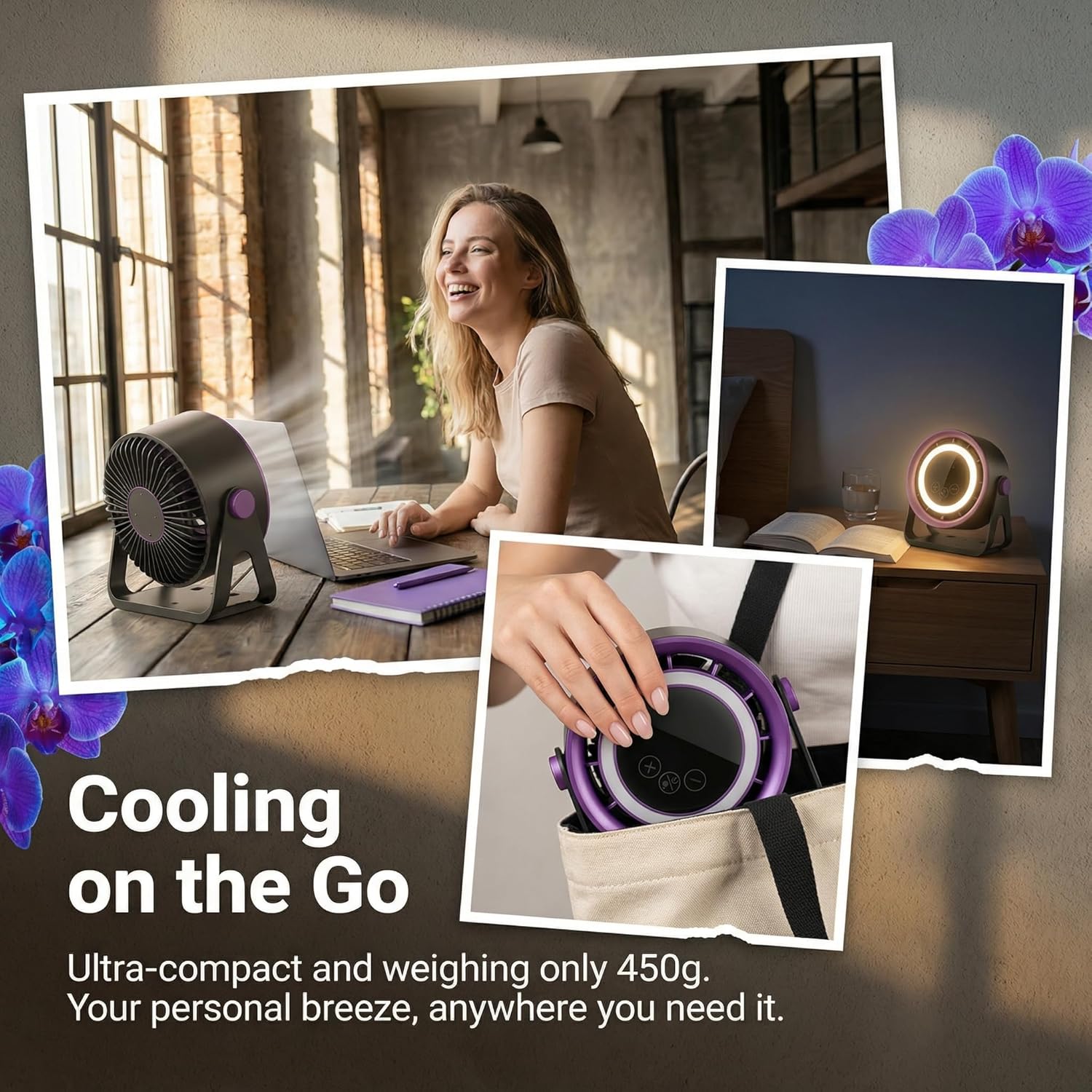 Desk Fan with Night Light–USB Rechargeable Small Table Fan, Touch Control Mini Desk Fan, 5 Stepless Speed, LED Display, 360° Tilt & Hangable for Office, Bedroom, Home, Camping, Portable Desktop Fan