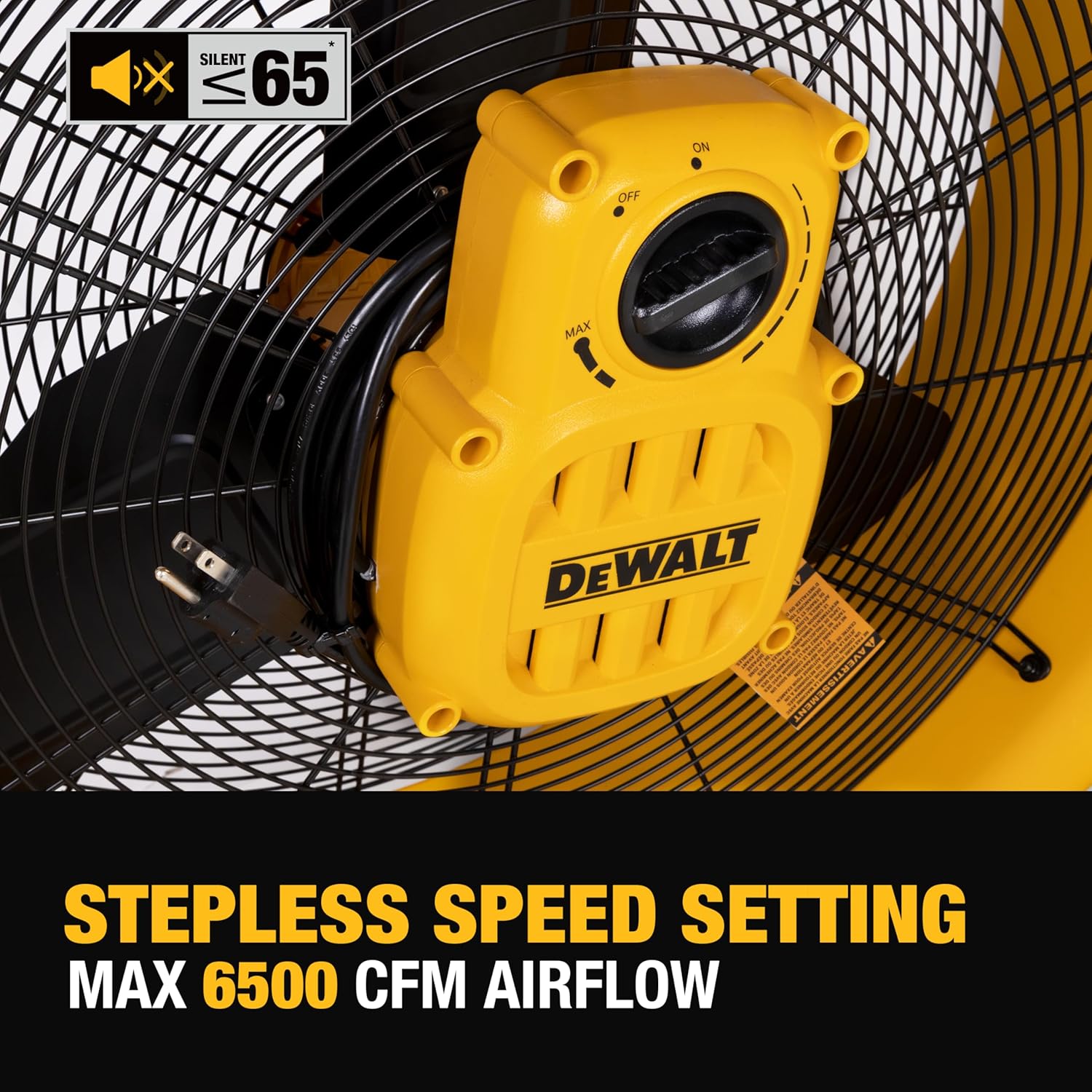 The DEWALT DXF2490 High Velocity Fan is engineered for high performance in various settings such as workshops, warehouses, and garages. With a powerful air flow of approximately 6500 CFM and a speed of 1050 RPM, it efficiently cools large areas. The fan features three aluminum blades with a 12-inch radius, ensuring effective air circulation. Its solid steel construction enhances durability, making it suitable for industrial use.