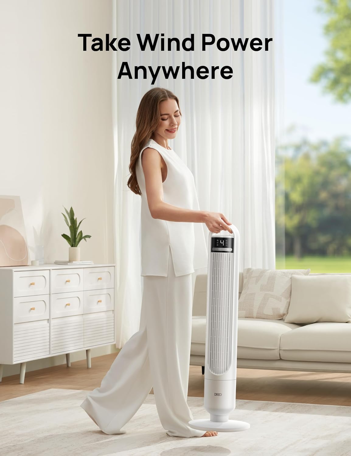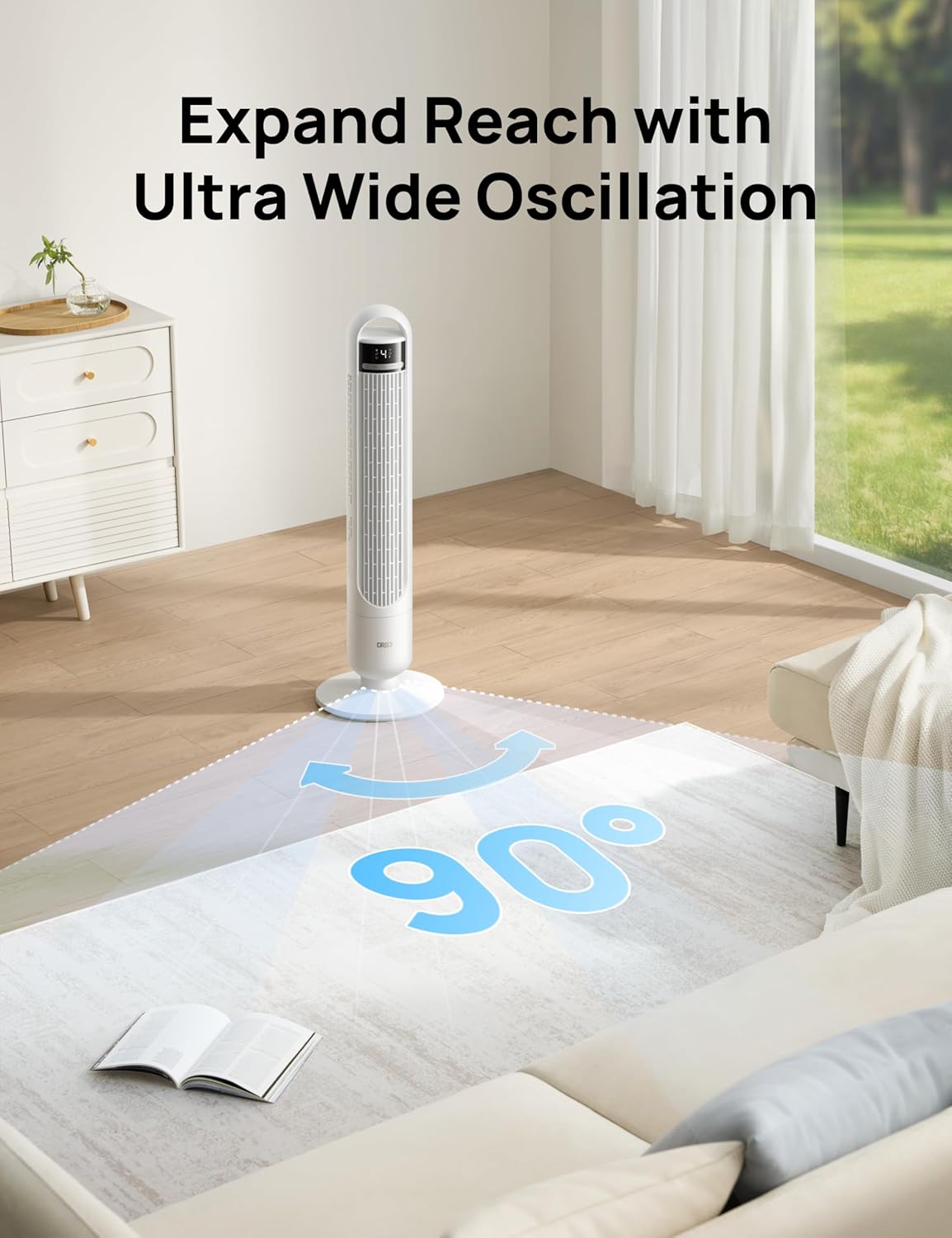 The DREO Tower Fan is designed to provide a comfortable and refreshing breeze in your bedroom or office. With a powerful air velocity of 25ft/s, it quickly cools down your space, making it ideal for hot summer days. This fan features 90° oscillation, ensuring that air circulates evenly throughout the room.