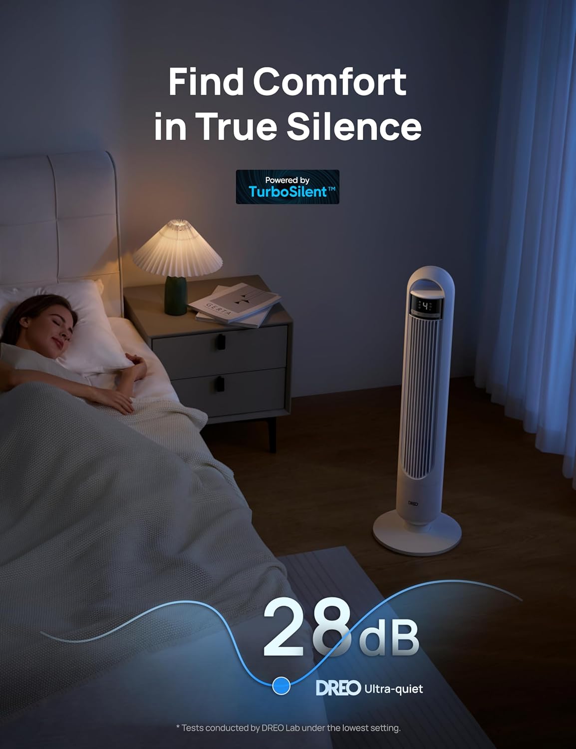 The DREO Tower Fan features 90° oscillation, 4 speed settings, 3 modes, a quiet operation at 28dB, a velocity of 25ft/s, an 8-hour timer, and a remote control.