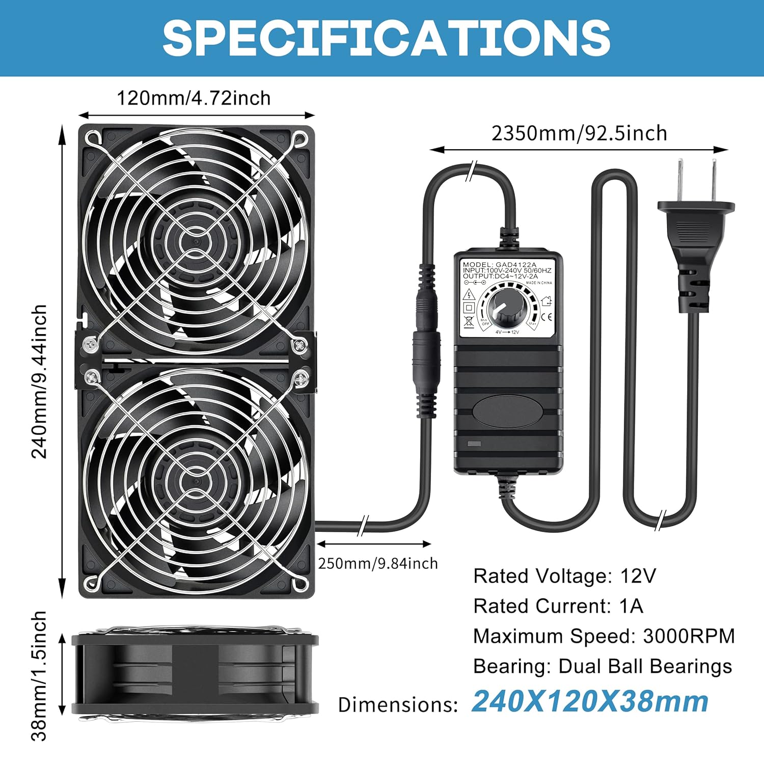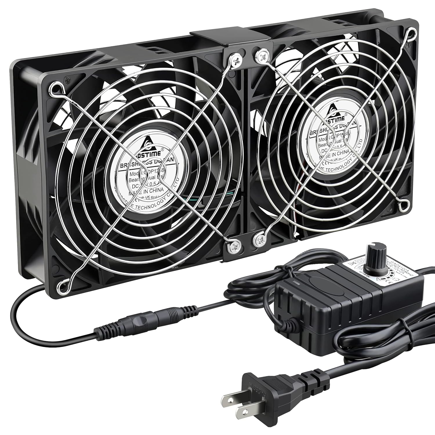 GDSTIME Big Airflow Dual 120mm X 38mm Fans AC 100V- 240V Fan with Infinitely Adjustable Speed Control, Computer Case Cabinet Chassis Greenhouse Incubators Server Workstation Electric Cooling Fans