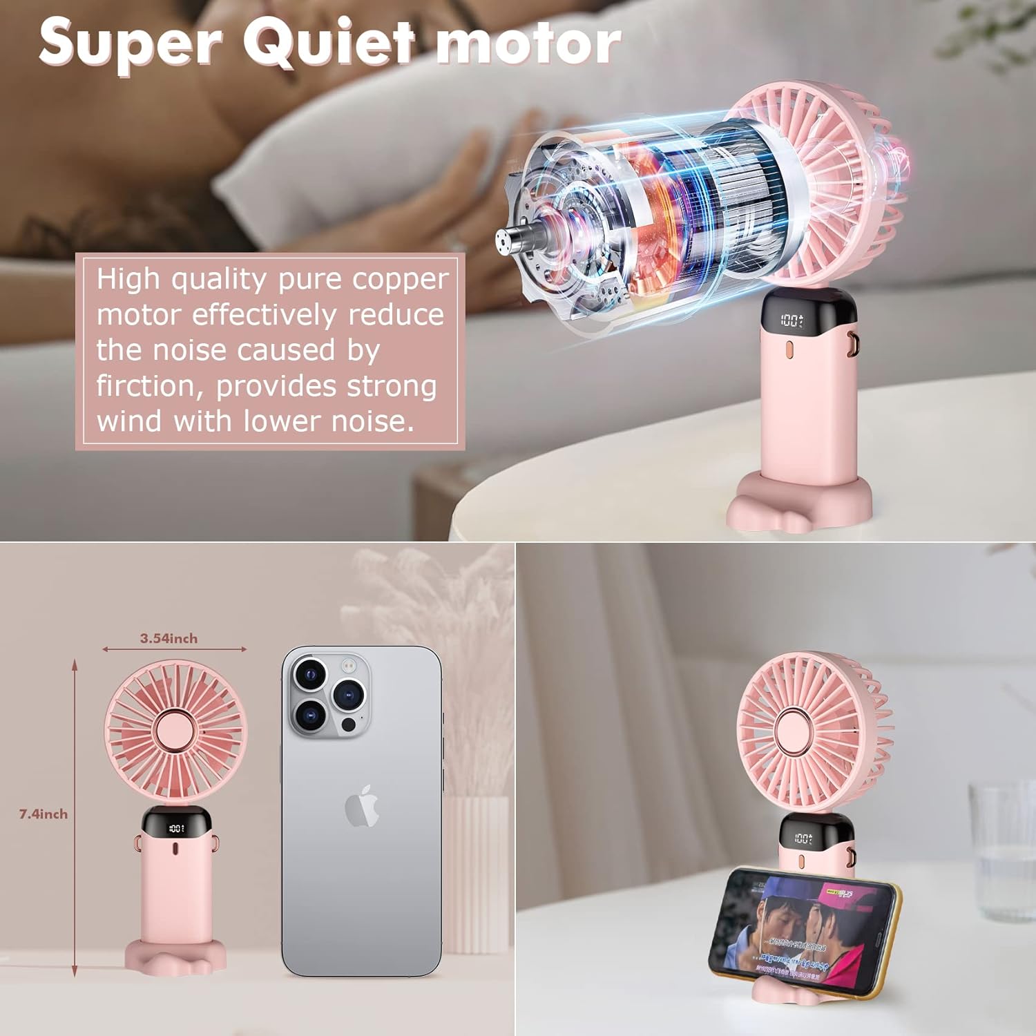 Handheld Fan, Mini Portable Fan USB Rechargeable, Small Pocket Fan 5 Speeds with Lanyard and Base, Built-in 4200mAh Battery USB Desk Fan Foldable for Office, Outdoor, Home, School (Pink)