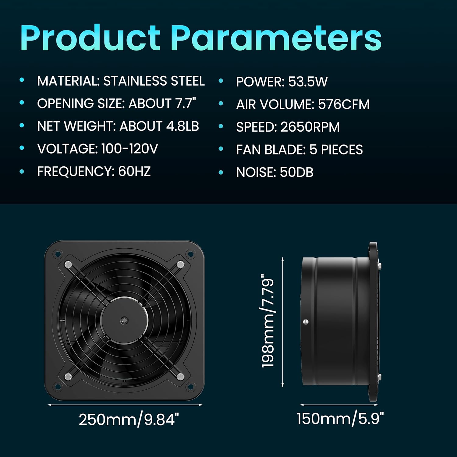 The HG Power 8 Inch Exhaust Fan is designed for efficient ventilation in various settings, including kitchens, bathrooms, and attics. With a powerful airflow capacity of 567 CFM, it effectively removes stale air and odors, ensuring a fresh environment. The fan features an adjustable speed controller, allowing users to customize the airflow to their needs. Additionally, it comes with a damper to prevent backdrafts, enhancing its efficiency.