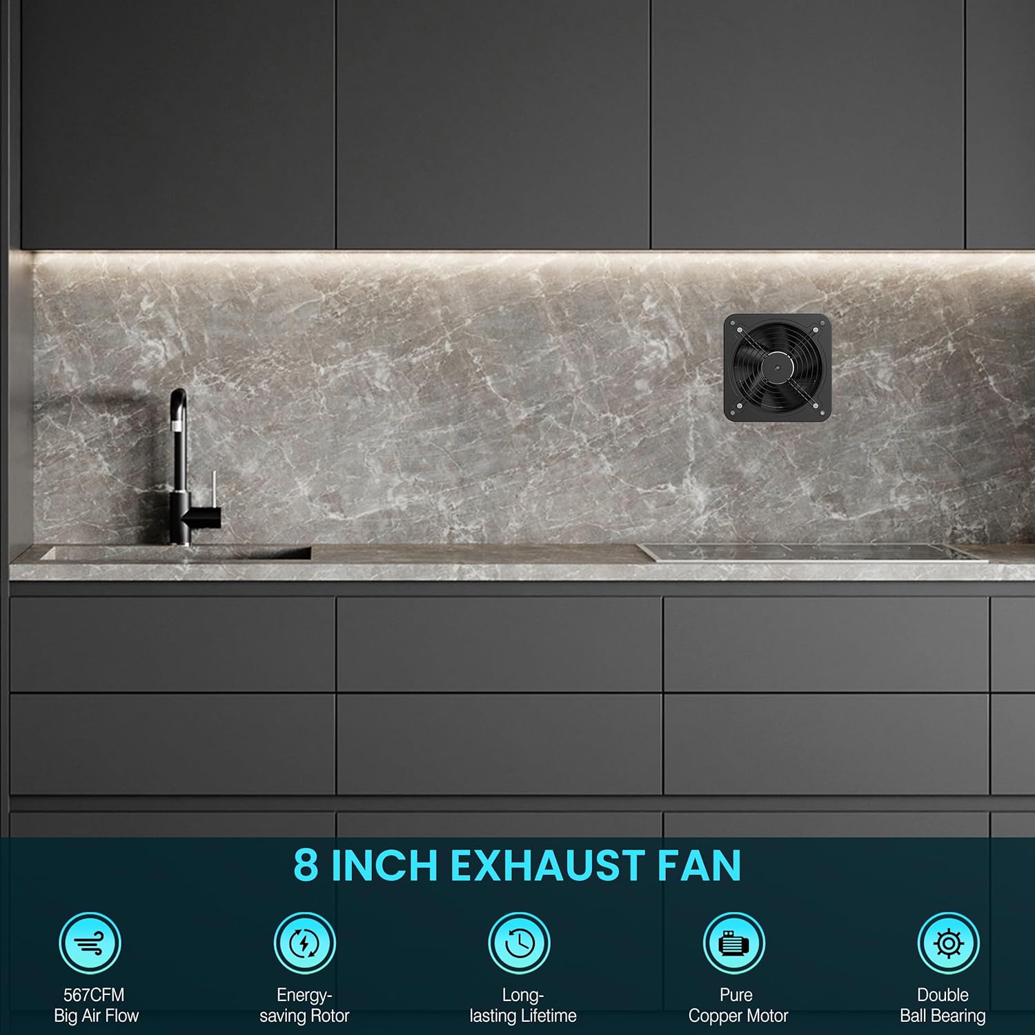HG Power 8 Inch Exhaust Fan with Speed Controller, 567CFM Kitchen Exhaust Fan with Damper, Wall Exhaust Fan, Metal Extractor Fan for Ceiling, Bathroom, Basement, Attic, Window Ventilation