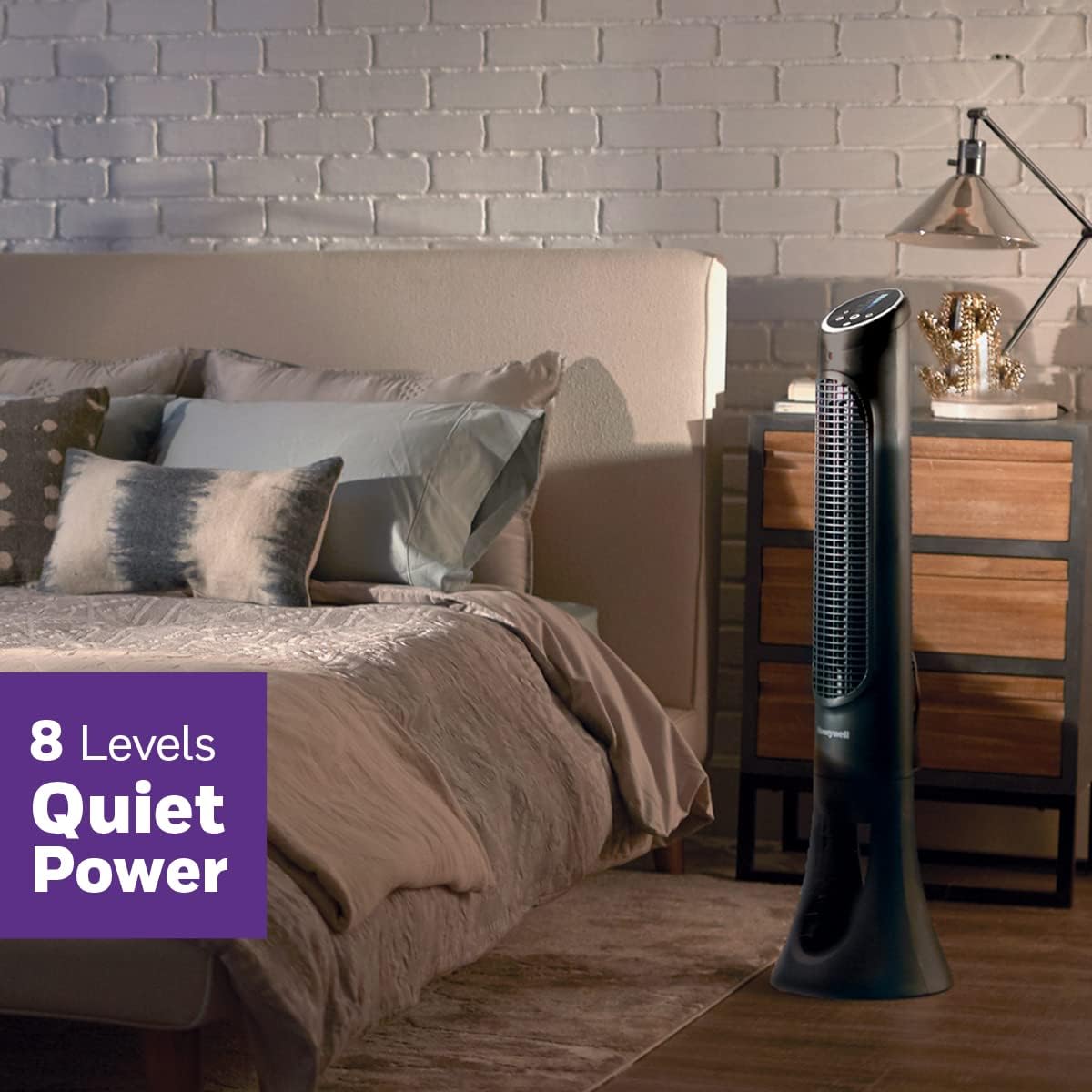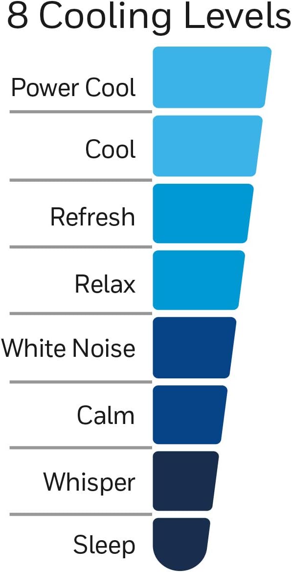 The fan features 8 powerful speed settings for personalized cooling.
