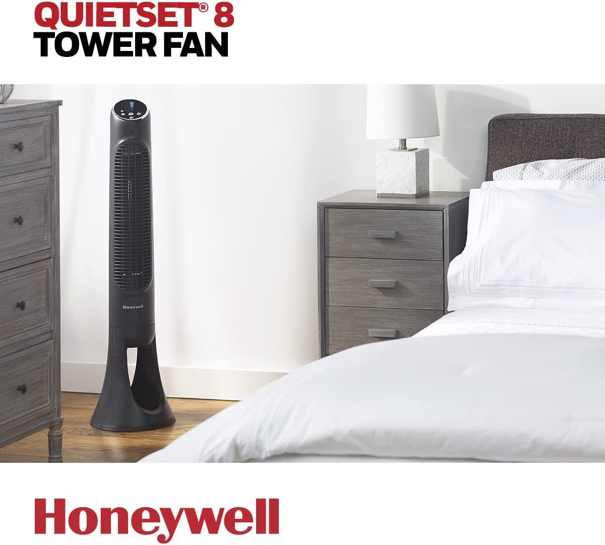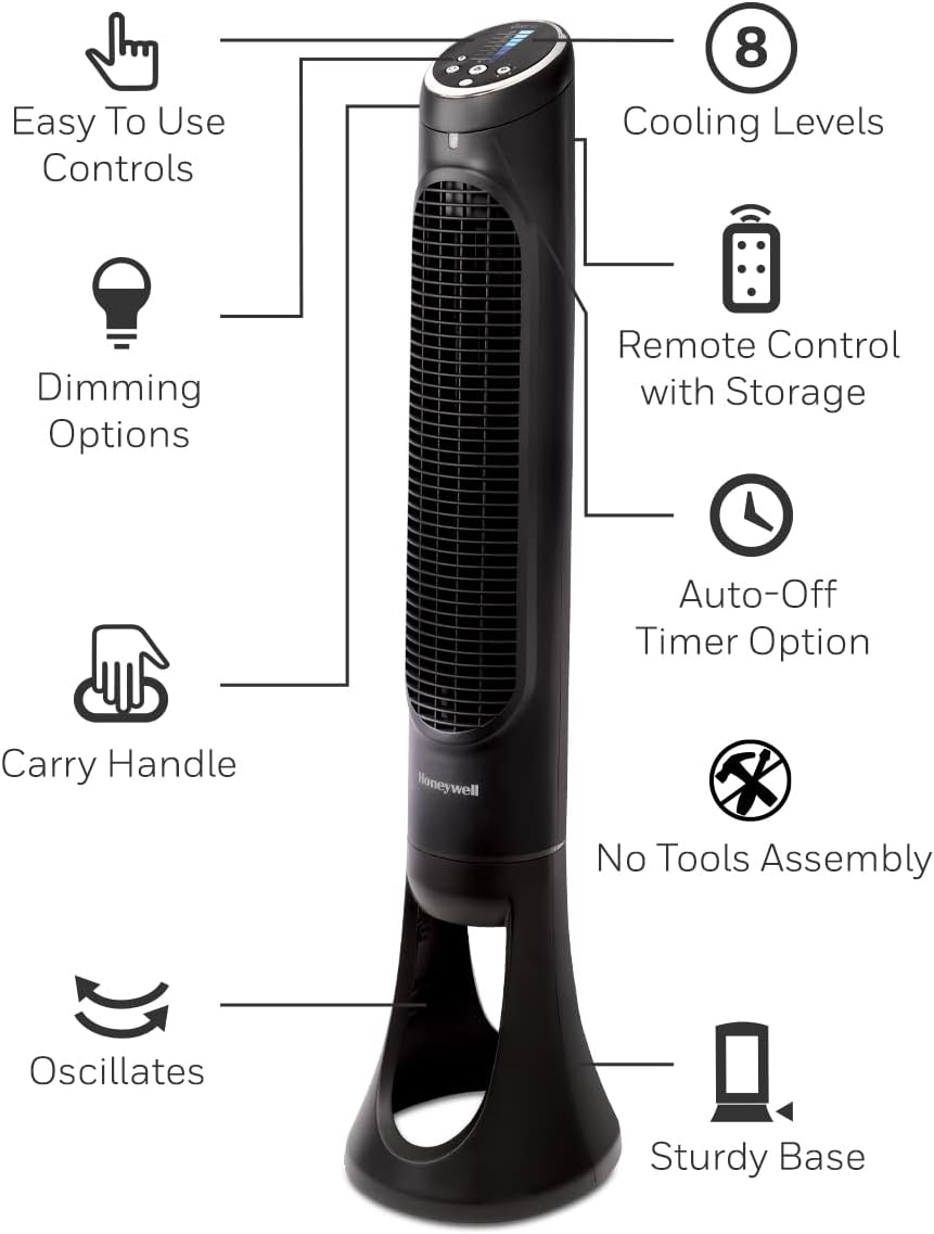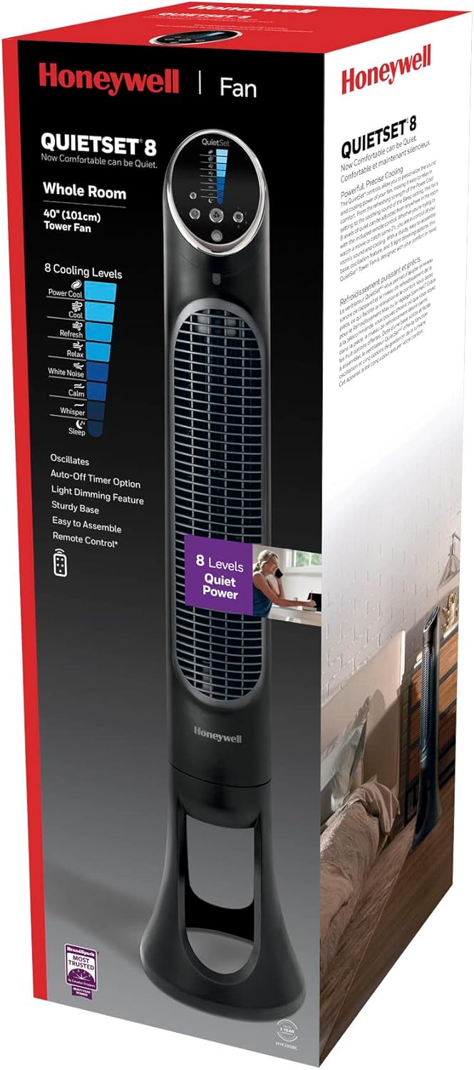 The Honeywell HYF290BC QuietSet Whole Room Tower Fan is designed for comfort and versatility in any space. Standing at 40 inches tall, this fan features a sleek, slim profile that fits seamlessly into modern home decor. With 8 powerful speeds, you can easily adjust the airflow to your preference. The fan includes a 75-degree oscillation feature, ensuring that cool air reaches every corner of the room. It also comes with a remote control for added convenience, allowing you to change settings from across the room. The control panel offers 5 lighting levels, which can be dimmed for nighttime use.