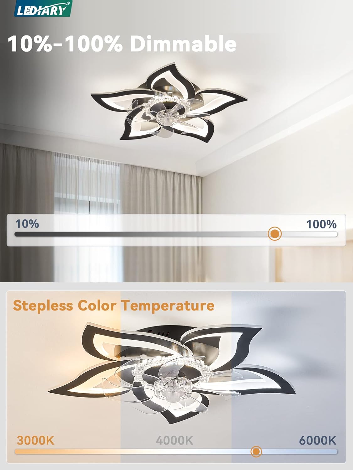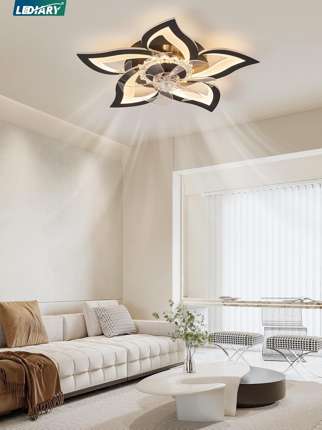The LEDIARY Flower Ceiling Fan is a modern addition to any indoor space, featuring a stylish design that complements various decor styles. With a 27-inch size, it is ideal for smaller rooms like bedrooms and kitchens. This flush mount ceiling fan not only provides a refreshing breeze but also includes a dimmable LED light fixture, allowing you to adjust the brightness to suit your mood or activity. The fan comes with a remote control for easy operation, enhancing convenience.