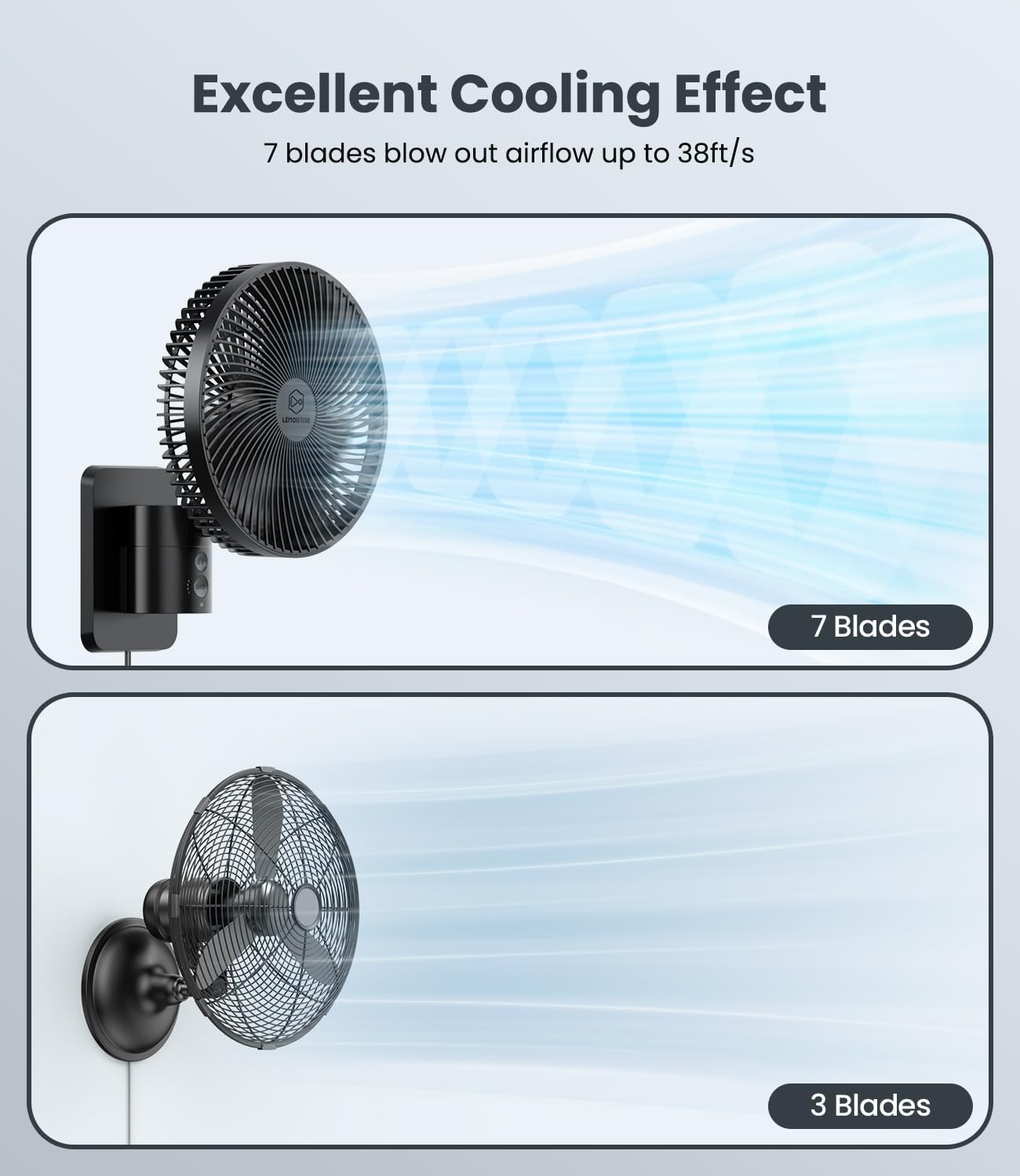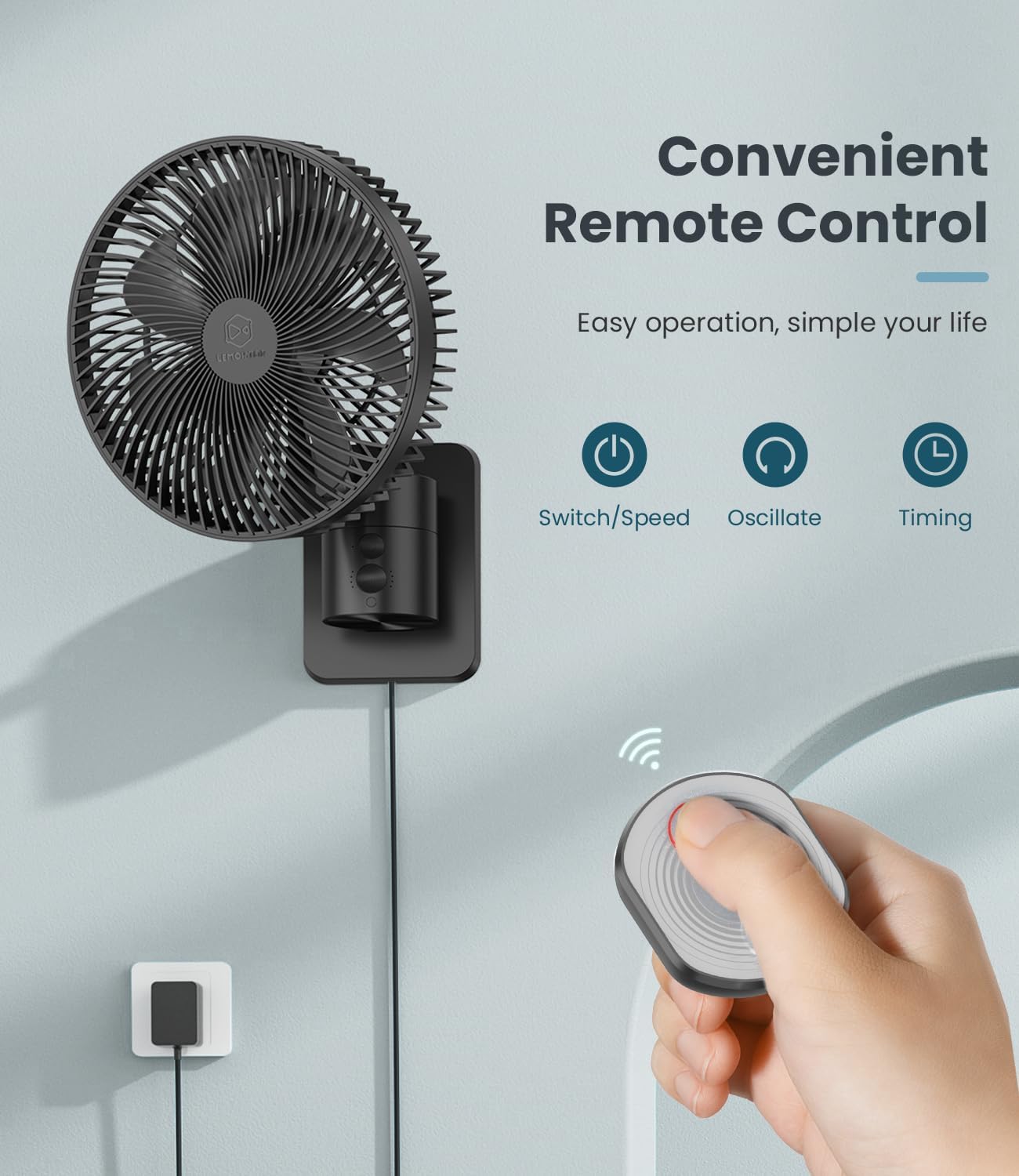 LEMOISTAR 8 Inch Small Wall Mounted RV Fan with Remote Control, 90° Oscillating, 4 Speeds, 4 Timer, Adjustable Tilt, 70 Inch Cord, Quiet, for Corner Bedroom Home Office Garage-Black