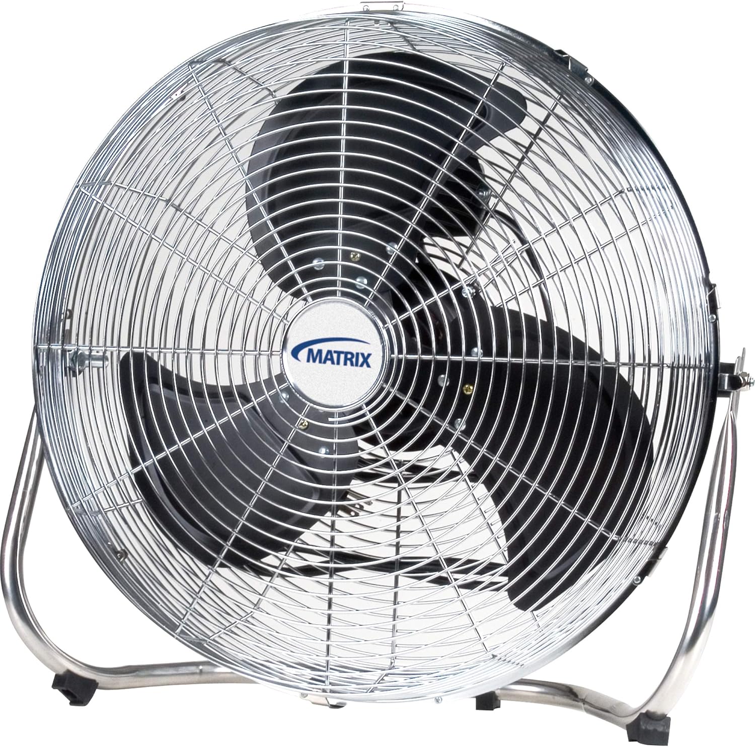 The Matrix Industrial Products High-Velocity Floor Fan is designed for commercial use, featuring a powerful 1/4 HP motor with three speed settings. With a diameter of 18 inches, this fan provides substantial airflow, making it ideal for large spaces. The all-metal construction ensures durability, while the chrome grill and base add a touch of style.