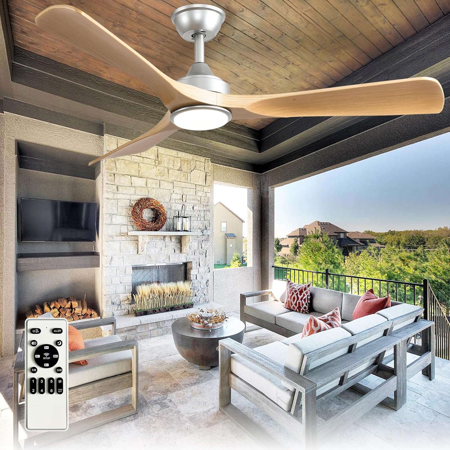 Outdoor Ceiling Fan with Light: 52 Inch 3 Blade Outdoor Fans for Patios – Modern Wood Ceiling Fan with Dimmable Light Remote APP Control Ultra Quiet Reversible DC Motor Timer