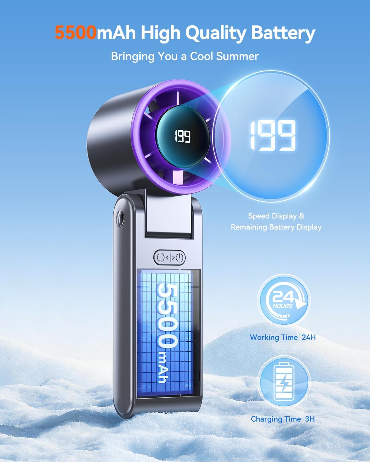 Portable Handheld Turbo Fan, 199 Gear Speed, 24 Hs Cooling Time, 5500mAh Rechargeable Mini Personal Hand Fan, Foldable Design, Travel Essentials, Beach Vacation, Gifts for Women, Men, Grey Purple