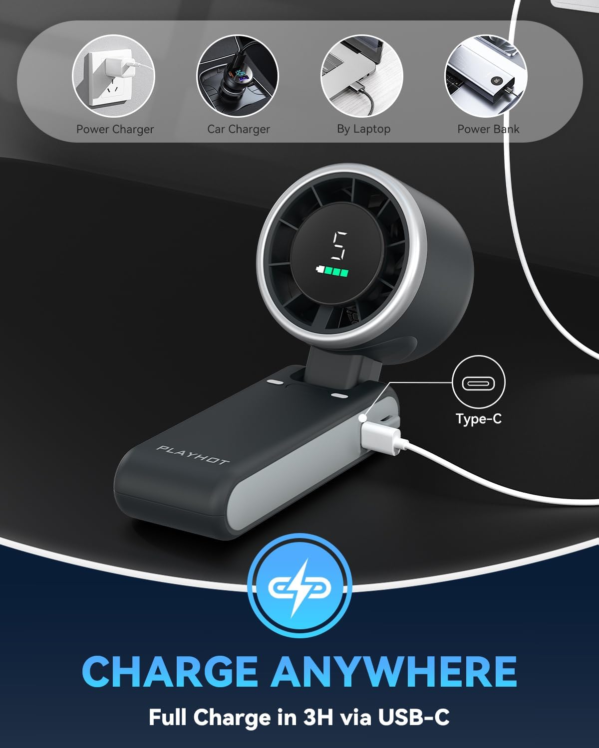Portable Handheld Turbo Fan, PlayHot 5 Gear Wind Hand Fan, 4000mAh Battery Personal Fans Portable Rechargeable, 20 Hours Pocket Fan, 3 IN 1 Hand Held Fan, Portable Fan for Travel/Outdoor/Indoor(Black)