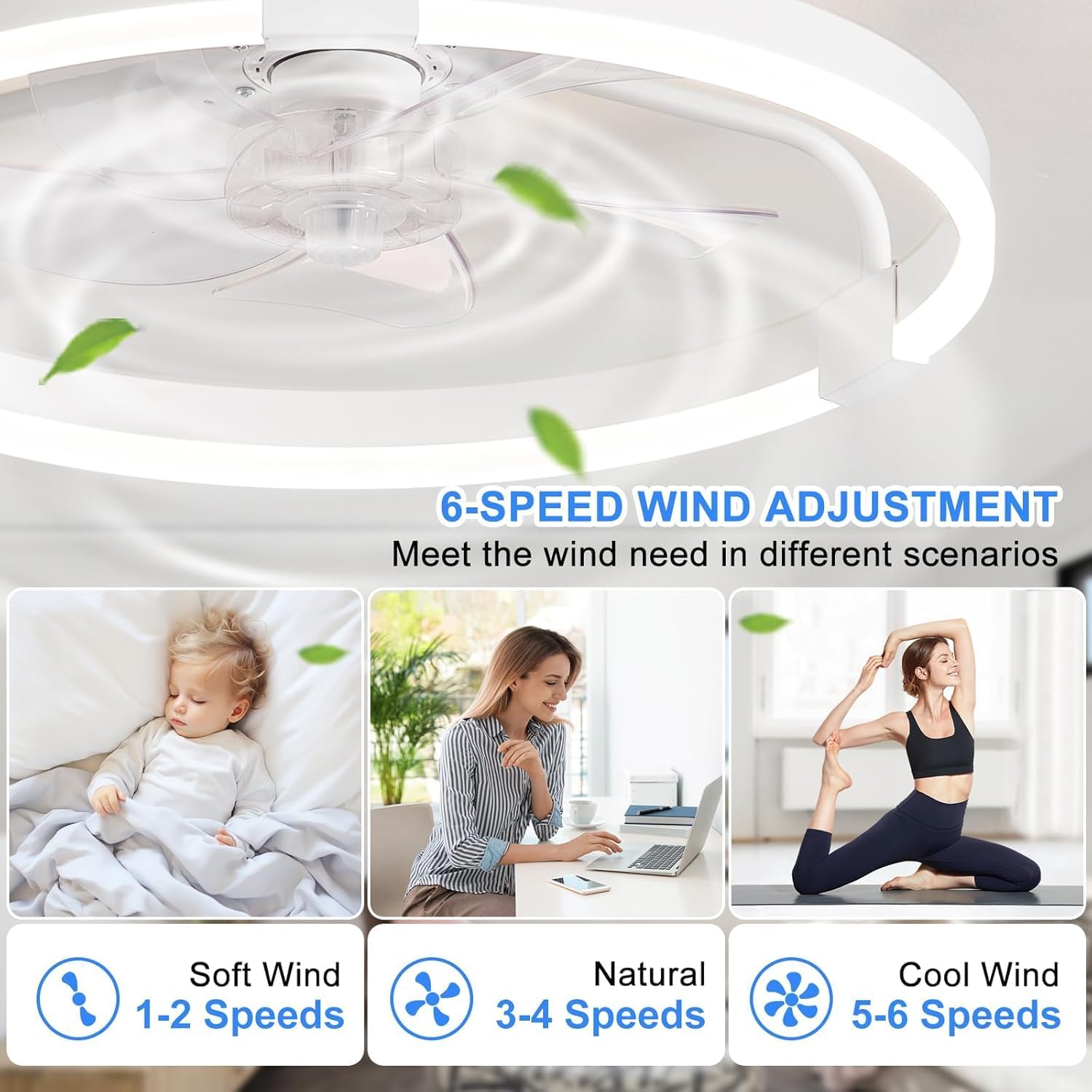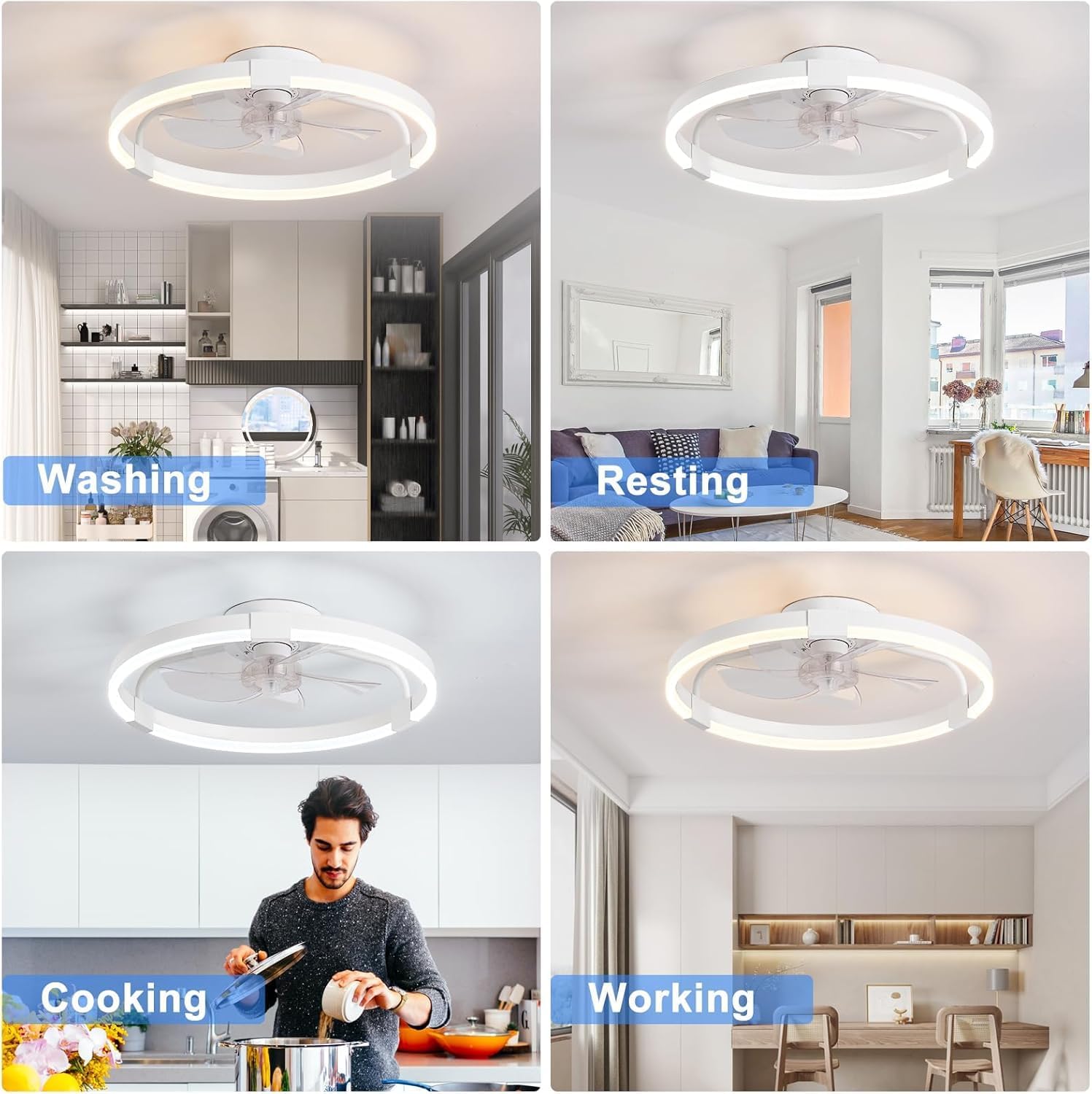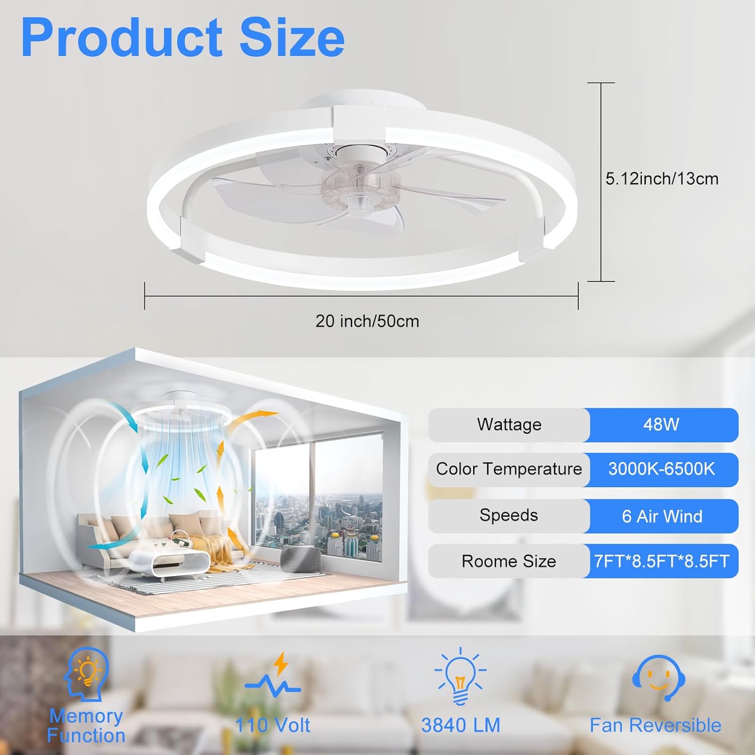 POWROL Ceiling Fans with Lights and Remote, 20 Inch 6 Speeds Reversible Flush Mount Ceiling Fan with Light, LED Dimmable Modern Low Profile Ceiling Fan for Bedroom Kitchen