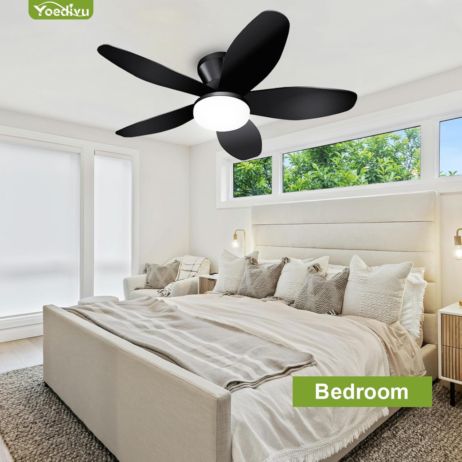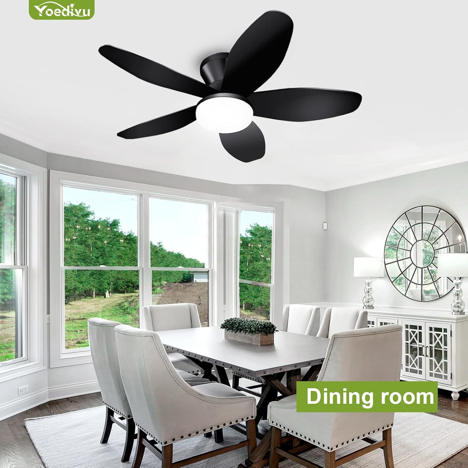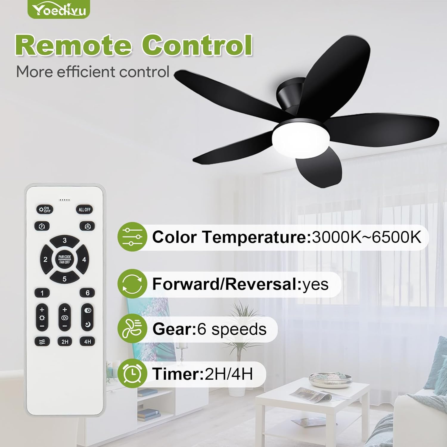 This 35-inch low profile ceiling fan is designed for modern spaces such as bedrooms and kitchens. Its sleek black finish and flush mount design make it a stylish addition to any room. The fan features three reversible blades, allowing you to adjust the airflow direction for both summer and winter use. With six wind speeds, you can easily find the perfect setting for your comfort. The included remote control adds convenience, letting you operate the fan from anywhere in the room.