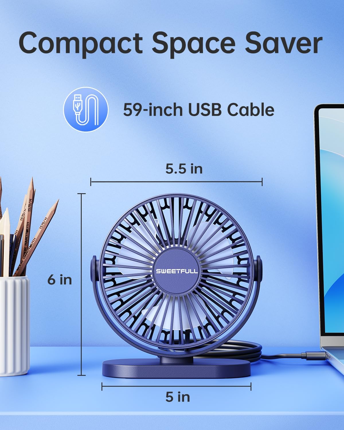 SWEETFULL USB Desk Fan Small Quiet – 3 Speeds Mini Personal Portable Fan 360° Rotation Adjustable, 5.5 Inch Office Table Cooling Gadgets on Desktop (Blue)