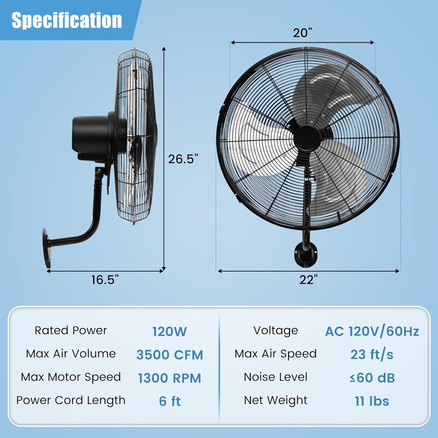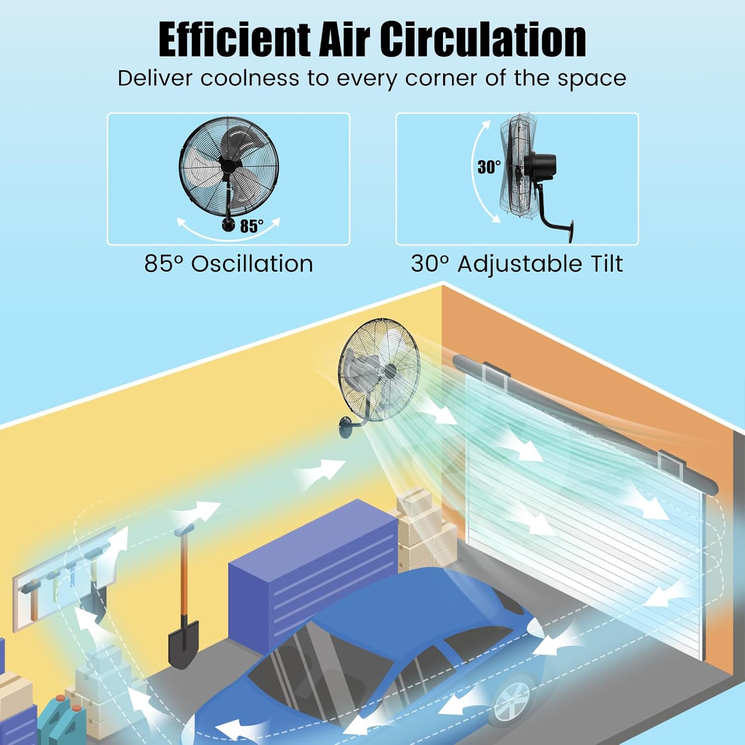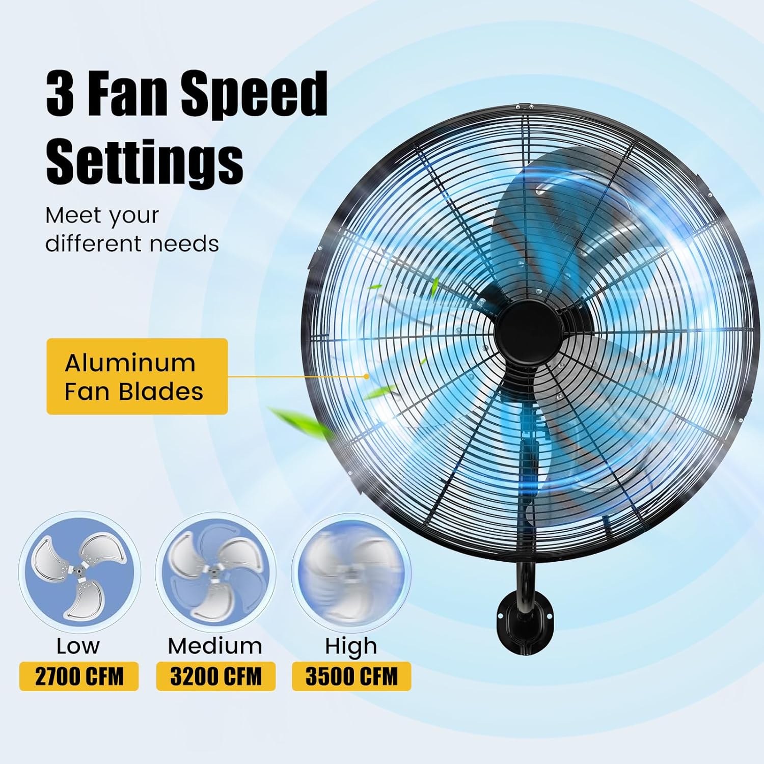 The Tangkula 20 Inch Wall Mount Fan is designed for efficient cooling in spaces where floor space is limited. It features three adjustable wind speeds: low (2700 CFM), medium (3200 CFM), and high (3500 CFM), allowing you to customize airflow according to your needs. The fan's metal grill ensures durability while promoting effective air circulation through horizontal and vertical oscillation. Additionally, the aluminum fan blades contribute to powerful airflow, making it suitable for various environments such as warehouses, workshops, and garages.