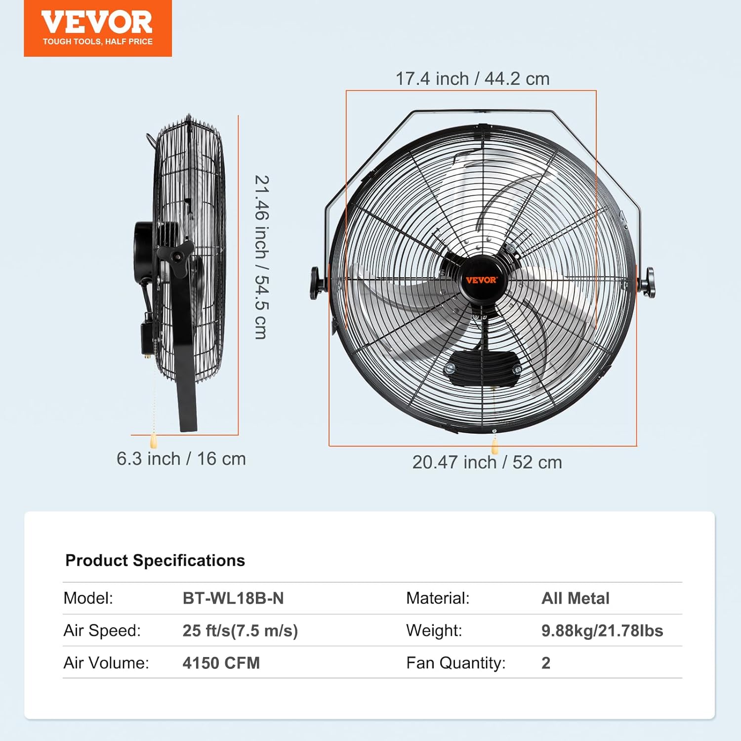 VEVOR Wall Mount Fan, 2 PCS 18 inch Manual 360-Degree Tilt Adjustment, 3-speed High Velocity Max. 4000 CFM Industrial Wall Fan for Indoor, Commercial, Warehouse, Workshop, Basement, Garage