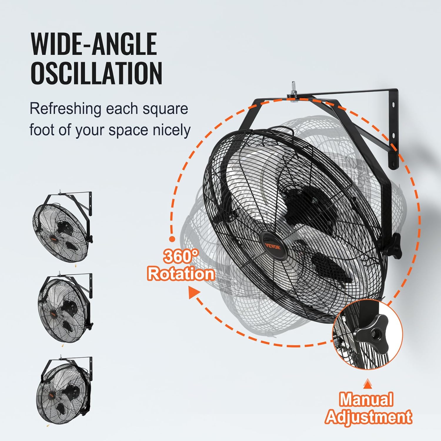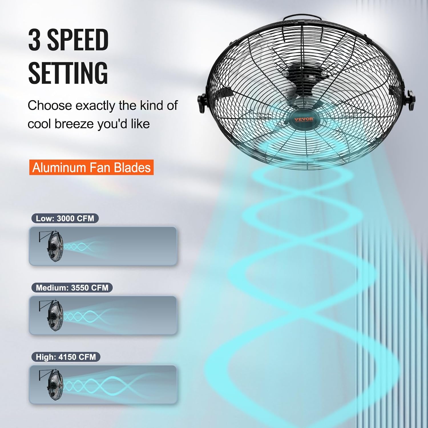 The VEVOR Wall Mount Fan is designed to provide powerful cooling for various settings, including warehouses, workshops, and garages. This product features two 18-inch fans that are waterproof, making them suitable for both indoor and outdoor use. With three adjustable speed settings, you can easily customize the airflow to your preference. The fans deliver a maximum airflow of 4000 CFM, ensuring that even large spaces remain comfortable. The 30-foot air delivery range allows for effective cooling across expansive areas.