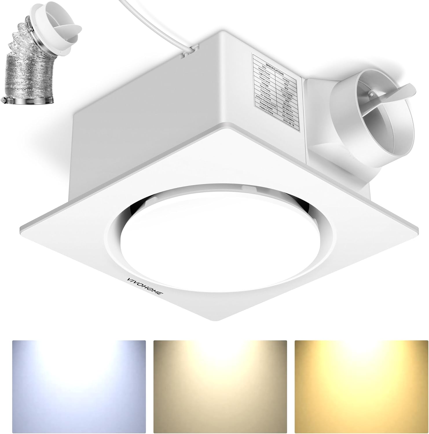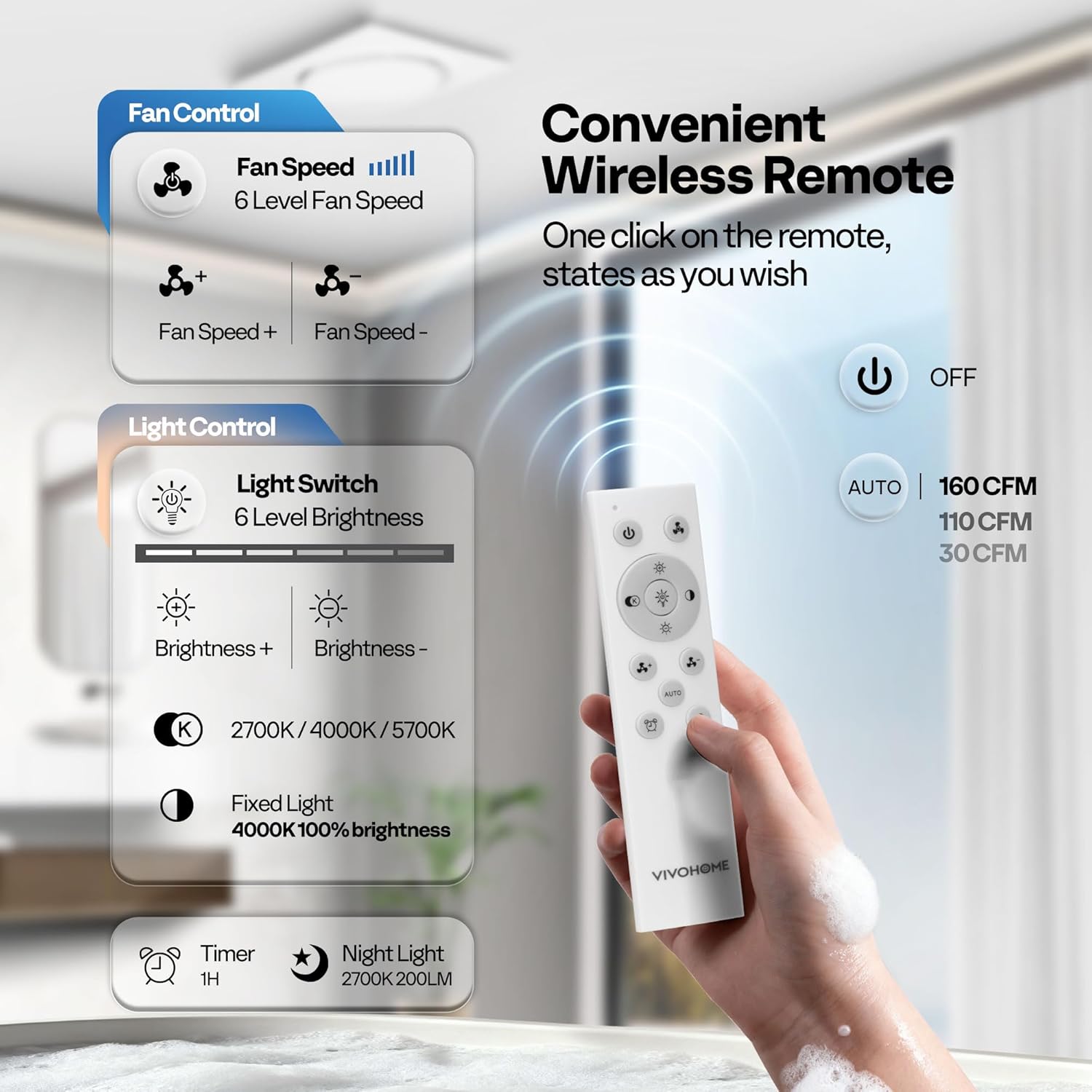 VIVOHOME AutoFlow Bathroom Exhaust Fan, 3CCT Diammable Light & Humidity Sensor (30-110-160CFM) – Energy Efficient EC Motor, Dual Insulation, Constant Airflow, (Install Kit, 4-in Duct)